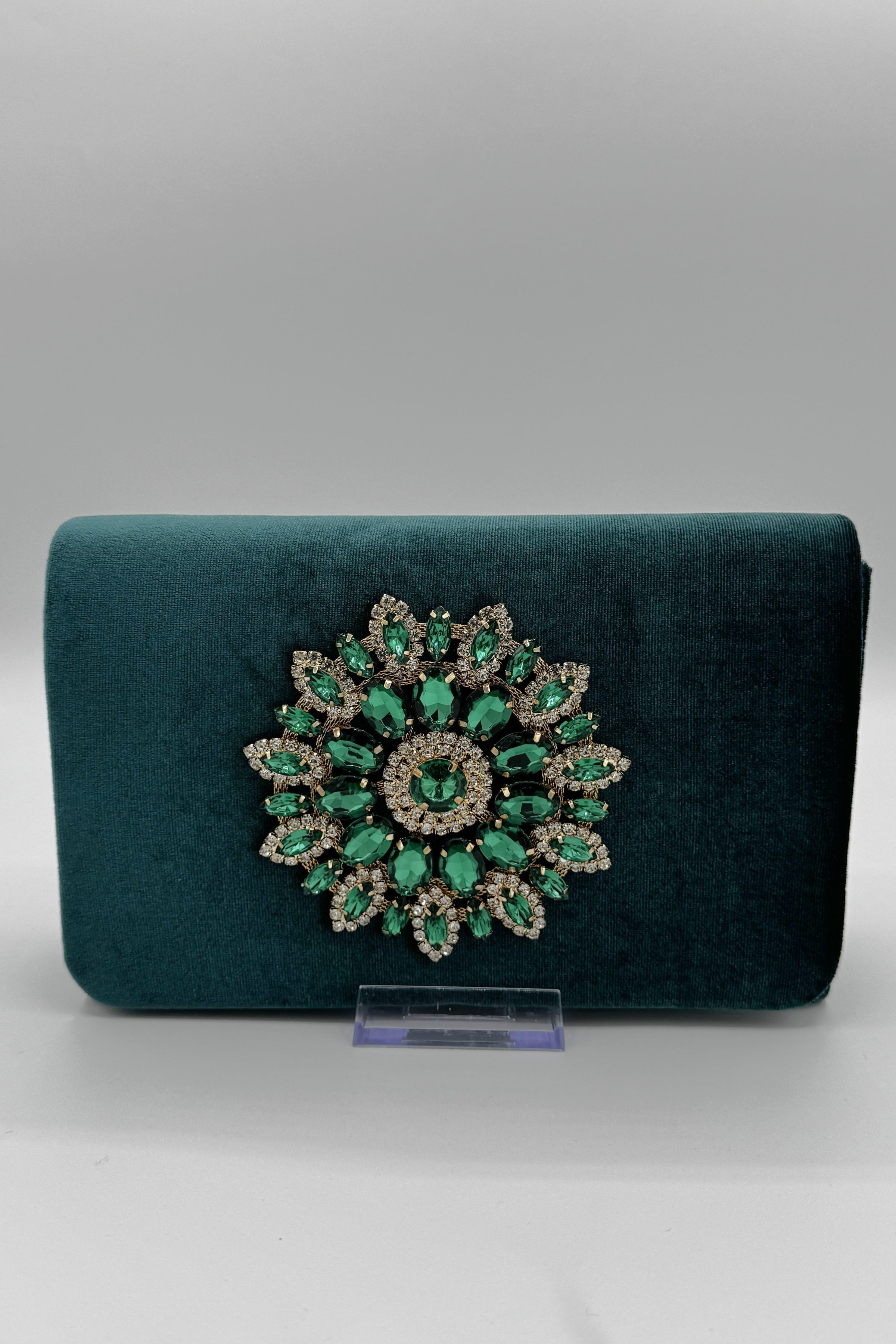 This luxurious velvet clutch features a striking crystal medallion centerpiece, meticulously arranged with emerald-green and clear stones for maximum brilliance. The structured silhouette offers timeless elegance, while the soft texture and jewel-tone finish create an opulent statement piece ideal for evening events or formal occasions.