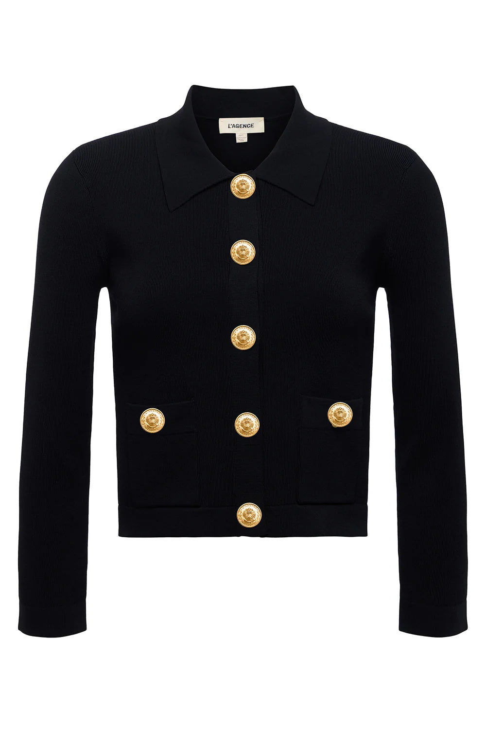 The Osiris Cardigan by L'Agence offers a timeless, chic look with thick stretch knit, cropped fit, padded shoulders, gold-buttoned faux welt pockets, and a refined button-front closure for a perfect feminine silhouette.
