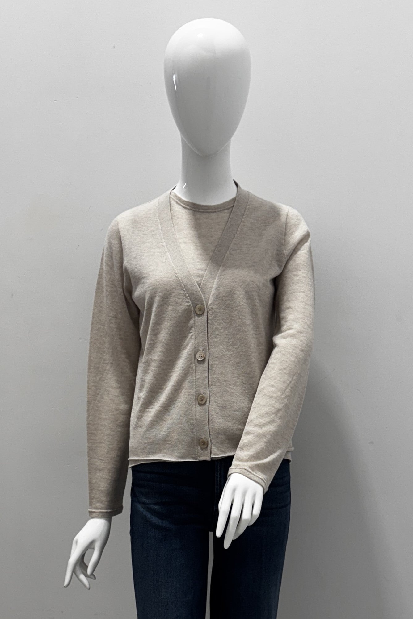 Luxuriously soft yet practical, this long-sleeve cardigan is crafted from 100% machine-washable cashmere. Designed with a classic V-neckline, front button closure, and a lightweight drape, it offers timeless elegance with modern ease in versatile neutral shades.