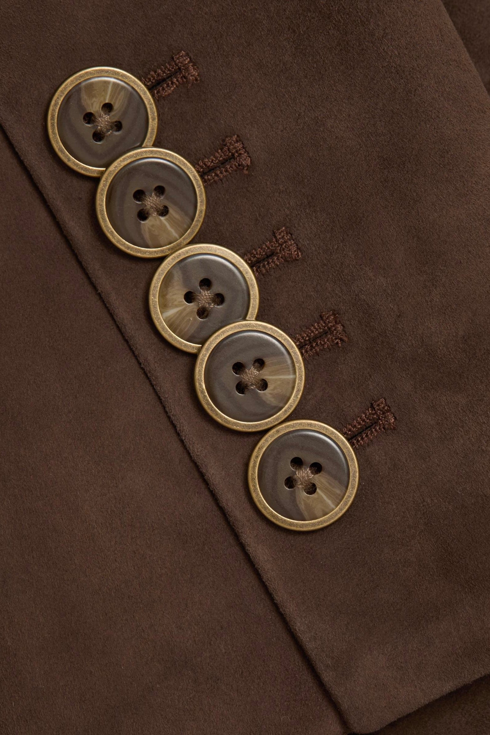 The Veronica Beard Duane Dickey Jacket is a timeless investment piece with rich texture and impeccable tailoring. Crafted from supple 100% lambskin suede in a warm mocha brown, it offers a soft, luxurious feel while maintaining a structured, elongating silhouette. The single-breasted design features a sharp peak lapel, cutaway hem, and a mix of flap and welt pockets for a refined finish. Fully lined in smooth cupro for comfort and ease, this versatile blazer transitions seamlessly from casual to sophisticated. Pair it with denim and boots for a polished fall ensemble, or layer over tailored trousers for an elevated office look. A true wardrobe classic you’ll reach for season after season.