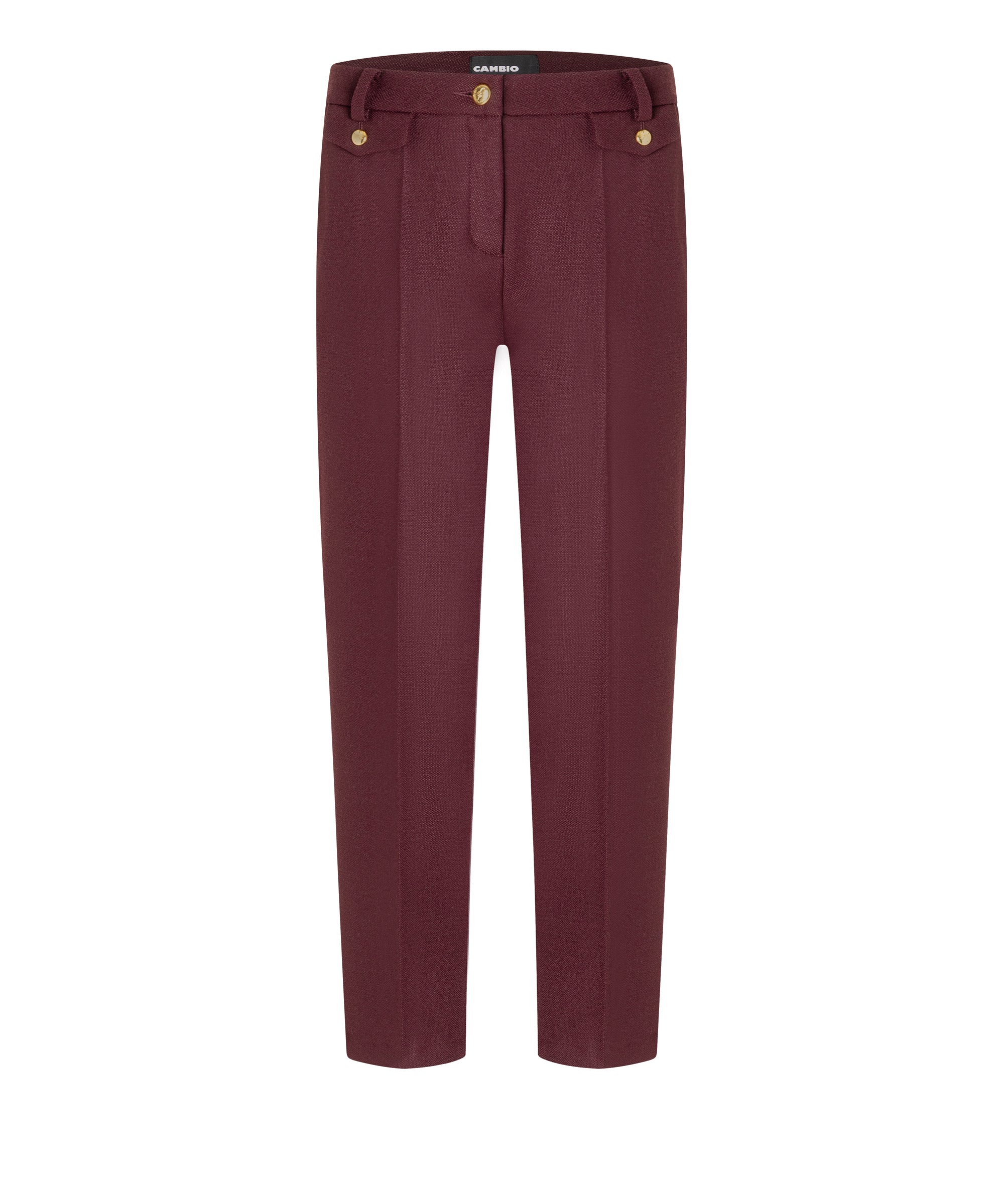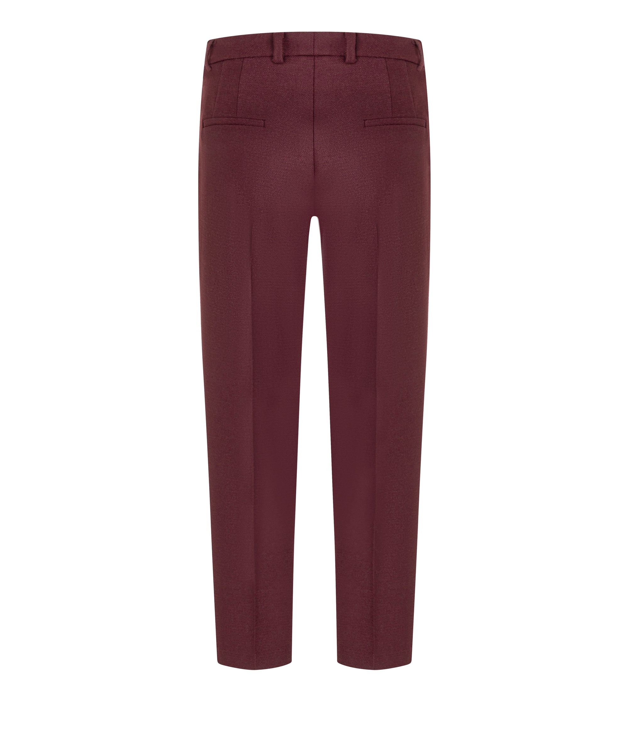 The Krystal flap pant showcases sleek tailoring in a deep burgundy hue. Designed with a slim, ankle-length silhouette, it features front creases, belt loops, and flap-tab detailing with gold-tone buttons at the waistband. A polished style that transitions effortlessly from day to evening.