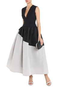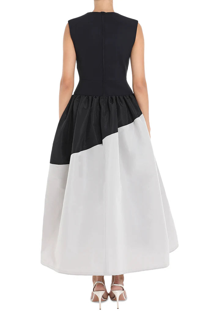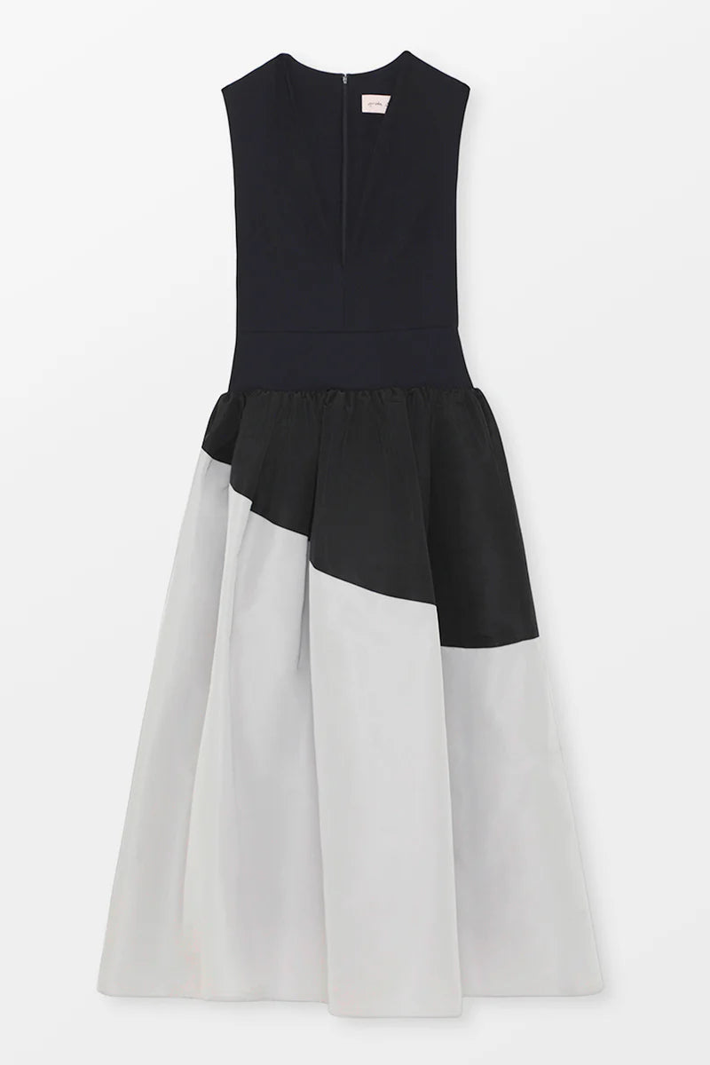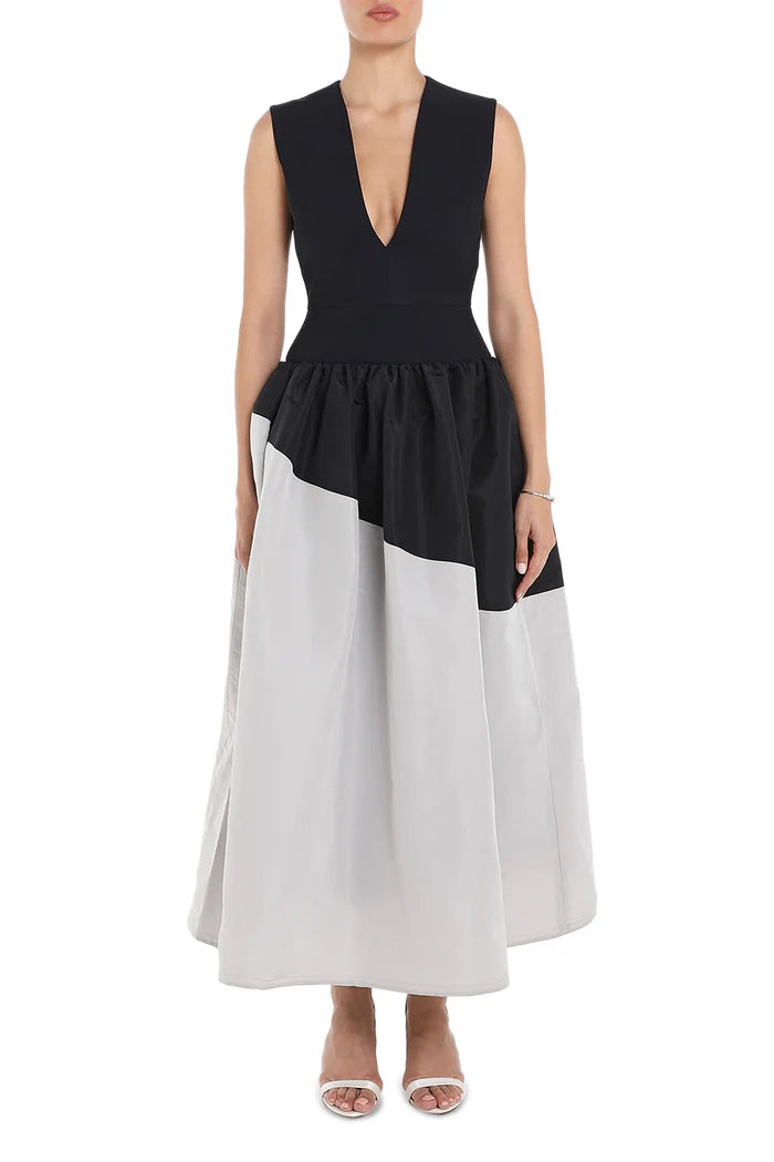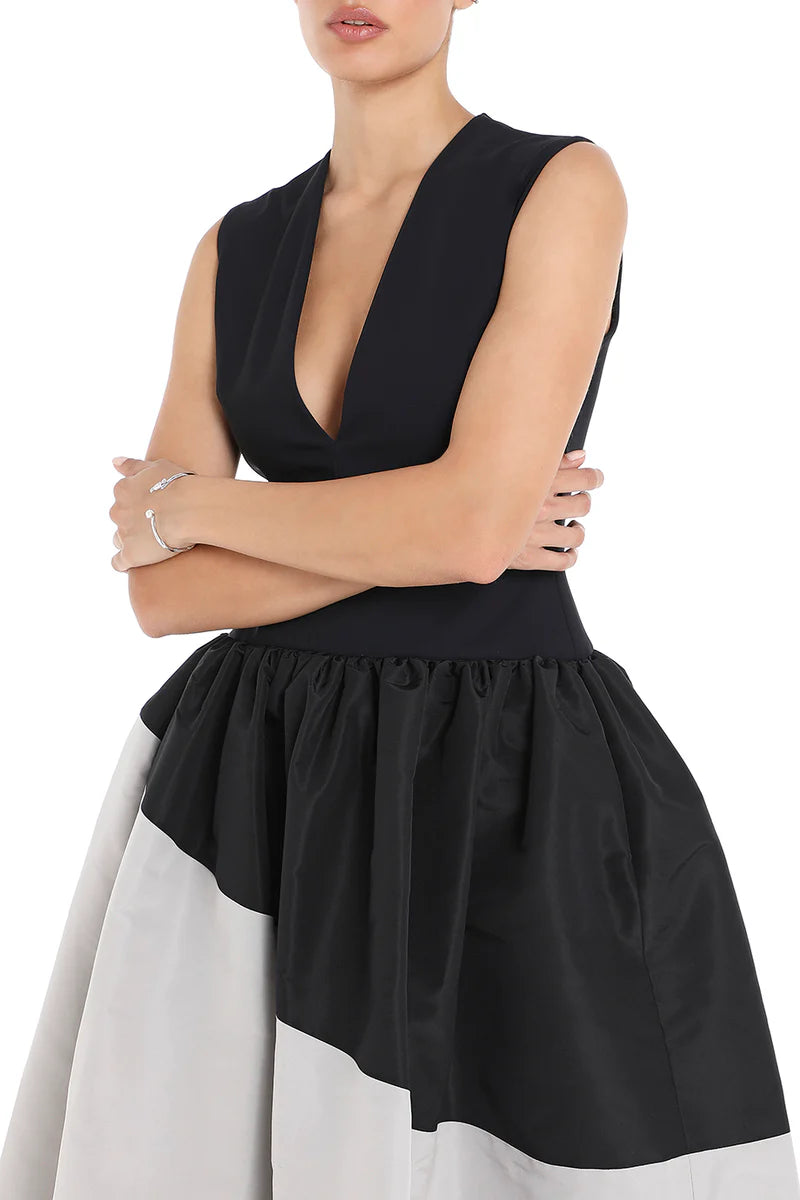 The Aphne sleeveless dress features a deep V neckline with a dropped waist and a gathered skirt.