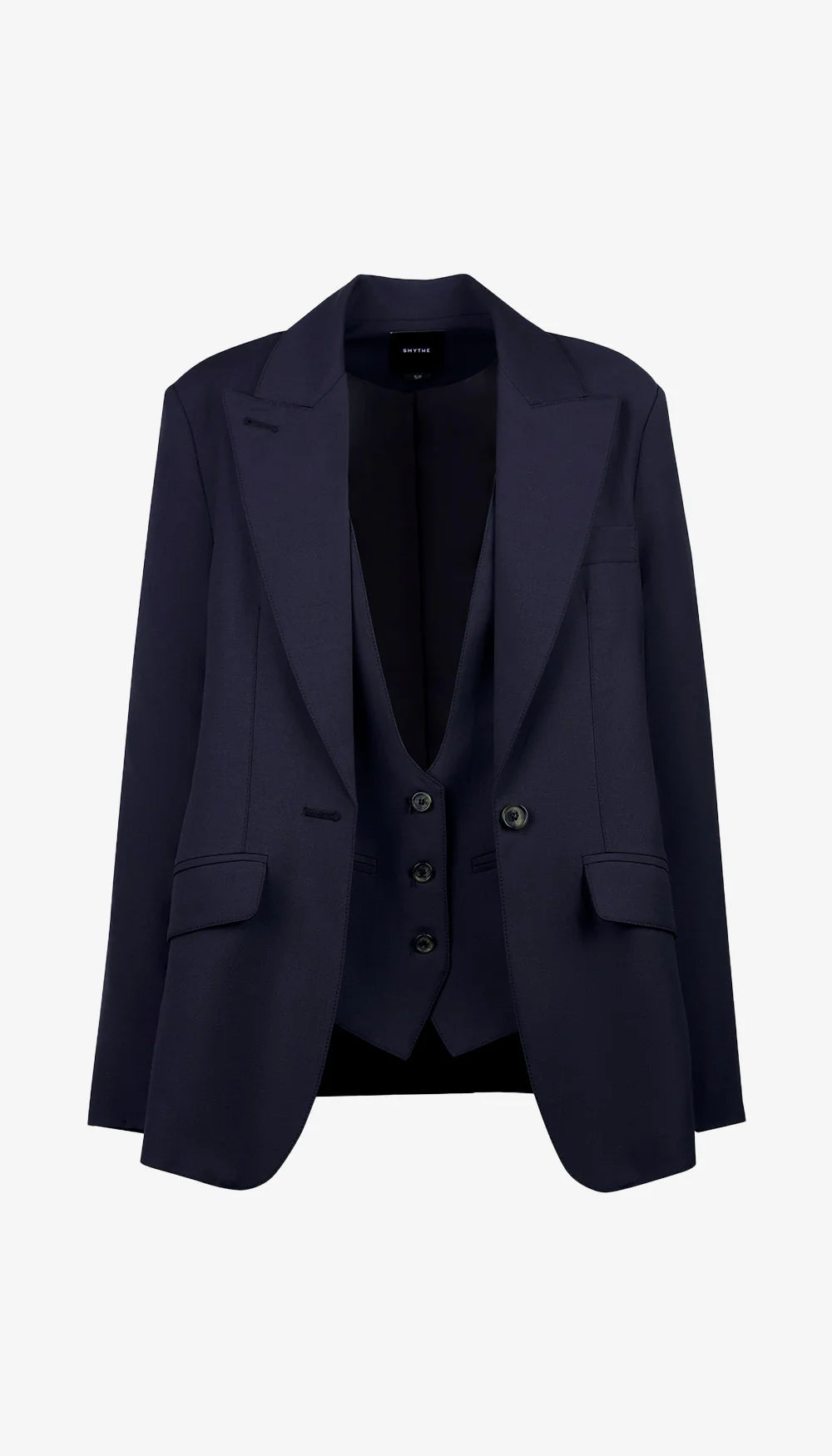 A longline silhouette, this new oversized blazer features a detachable vest that can be worn open or closed. This garment is oversized.