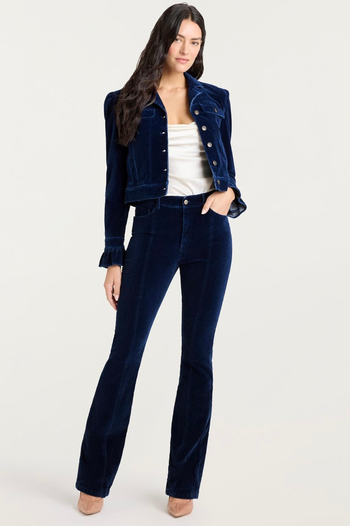 Cinq à Sept’s Velvet Denim Shailene Pant reimagines a timeless silhouette in a striking fabrication. Designed with the brand’s signature flared bootcut leg, this style is tailored in plush velvet denim that offers both structure and softness. The rich texture brings an elevated twist to everyday denim, making it just as appropriate for casual afternoons as it is for evening outings. A classic button-and-zipper fly closure and functional front and back pockets keep the look grounded in utility, while the full-length cut elongates the frame with effortless sophistication. Whether paired with a sleek blouse for dinner or a cozy knit for daywear, the Shailene Pant delivers a versatile, modern wardrobe staple with undeniable polish.
