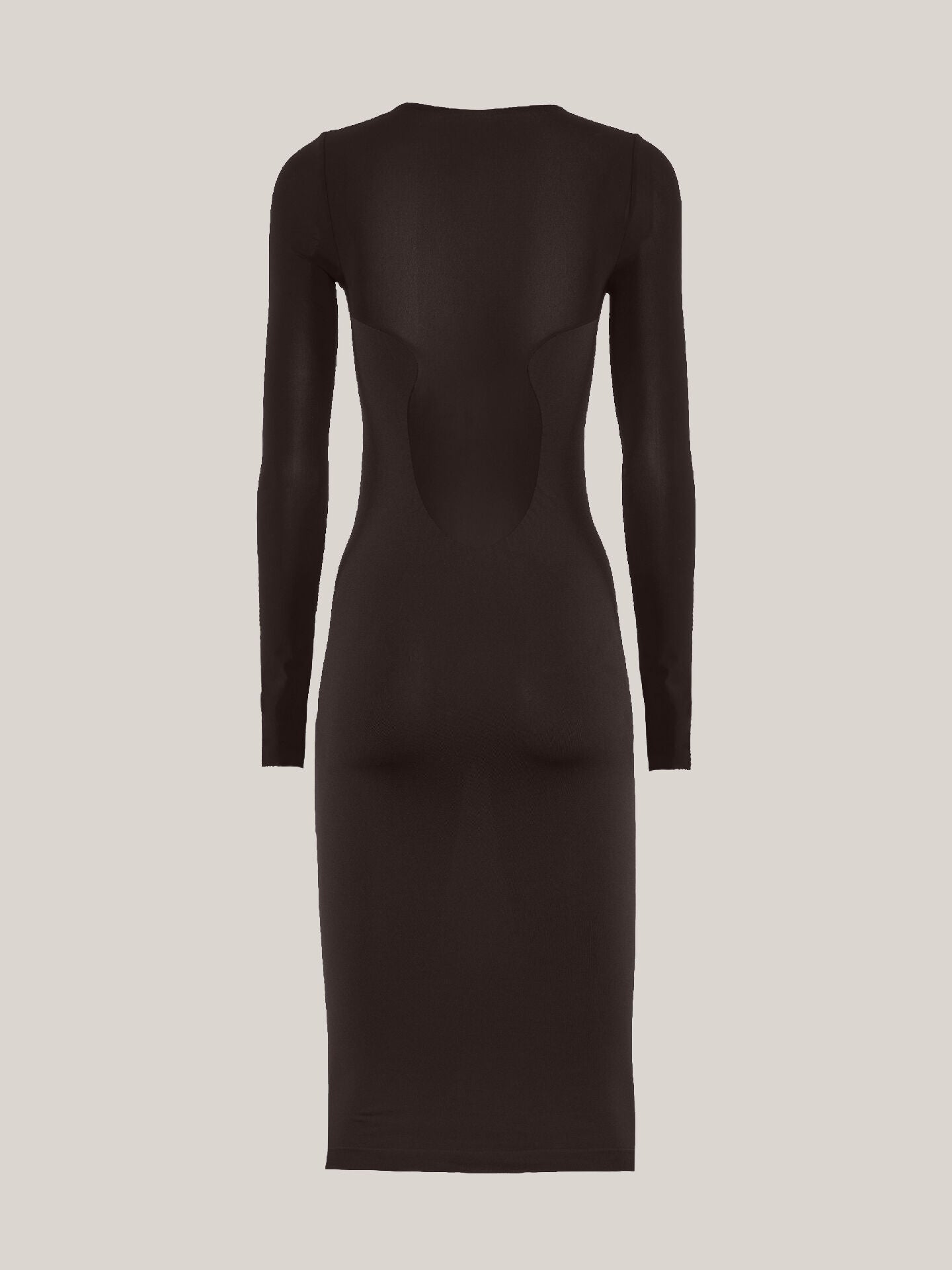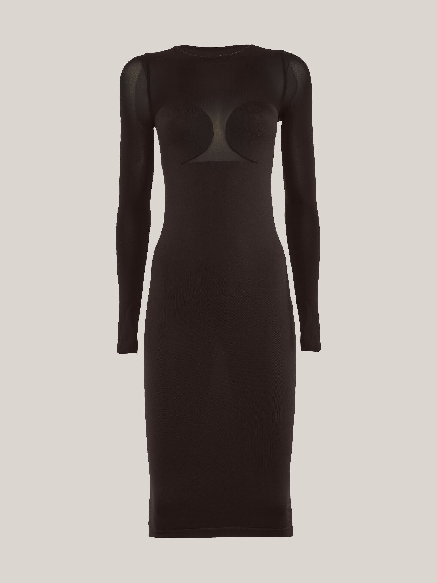 Turn heads in this figure-skimming dress featuring a sensual corset-inspired bodice with a semi-sheer overlay and sleeves. Beyond its enticing details, it also features Wolford's signature interplay of mattand shiny textures, created using the brand's circular knitting technique. Finished with a round neckline and knitted-in edges, the contouring fit hits right below the knee.