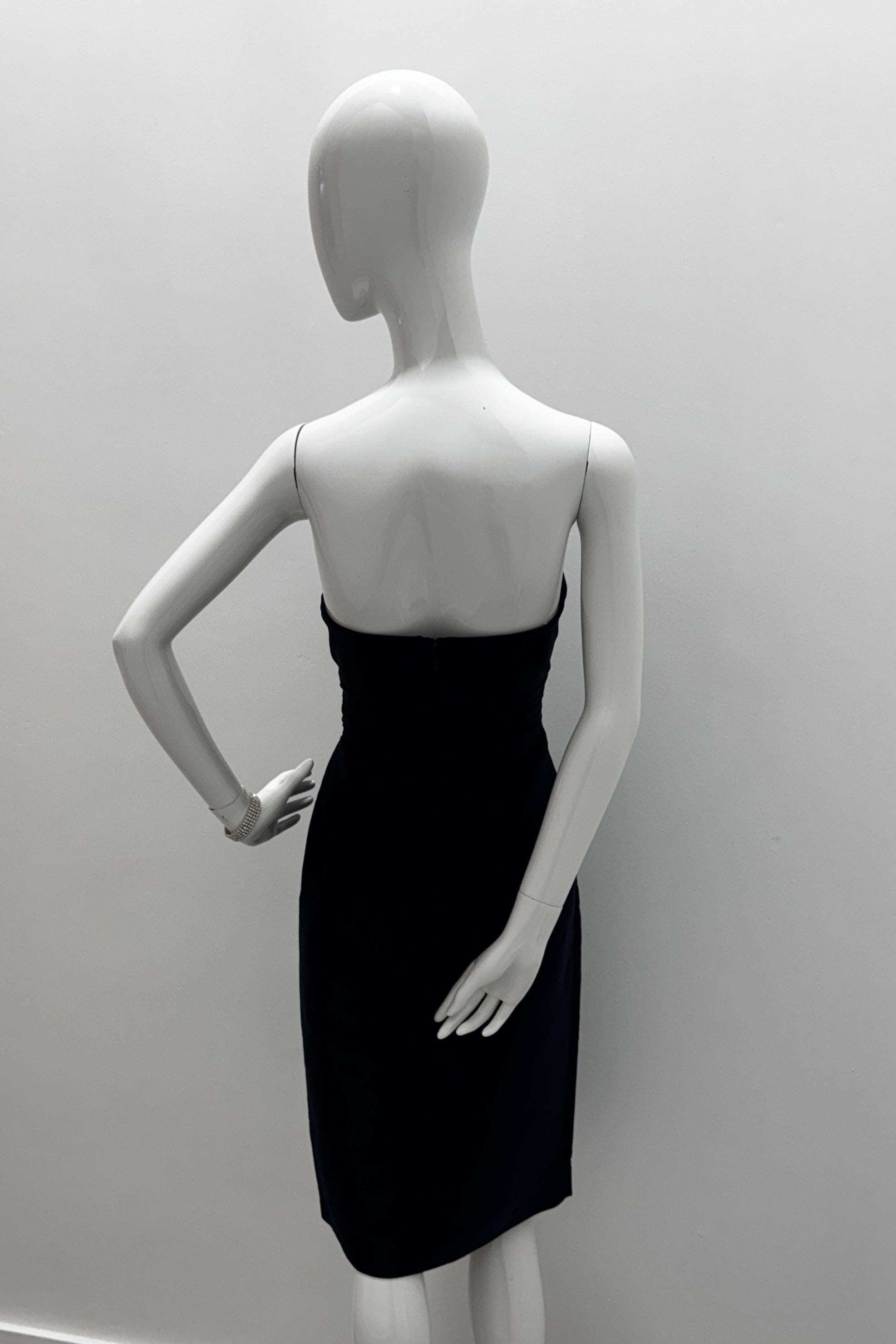 The midi dress features a clean strapless neckline, tailored sheath silhouette, and hand-placed pearl-cluster embellishments for refined texture. A soft side drape adds dimension while maintaining a structured, polished fit. Elegant and modern, it offers a sophisticated statement for special occasions.