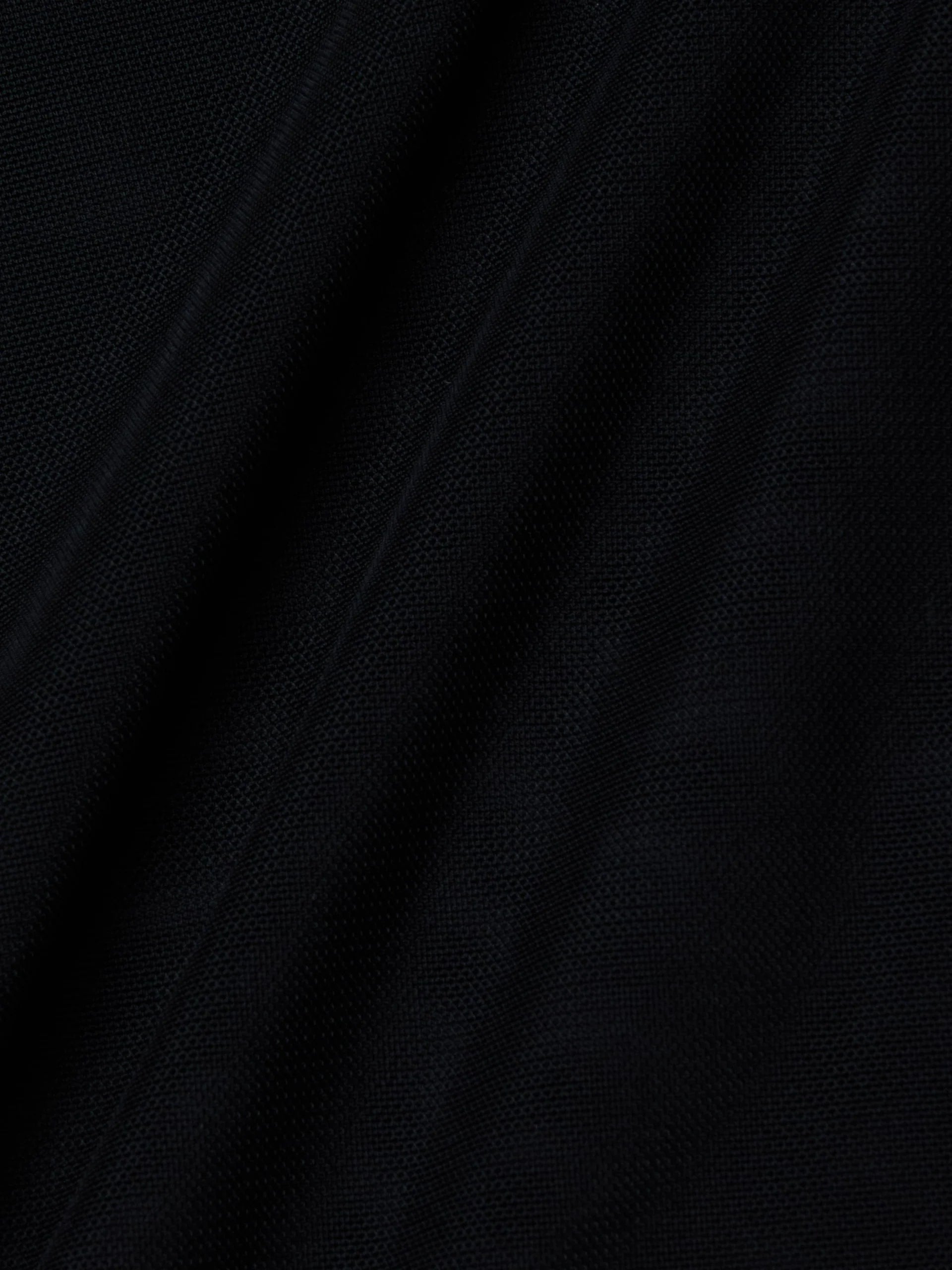 The Trista bodysuit is a form-fitting piece in black mesh with long sleeves and structured shoulder pads. Its semi-transparent design strikes a bold balance between elegance and edge, perfect for layering or statement styling.