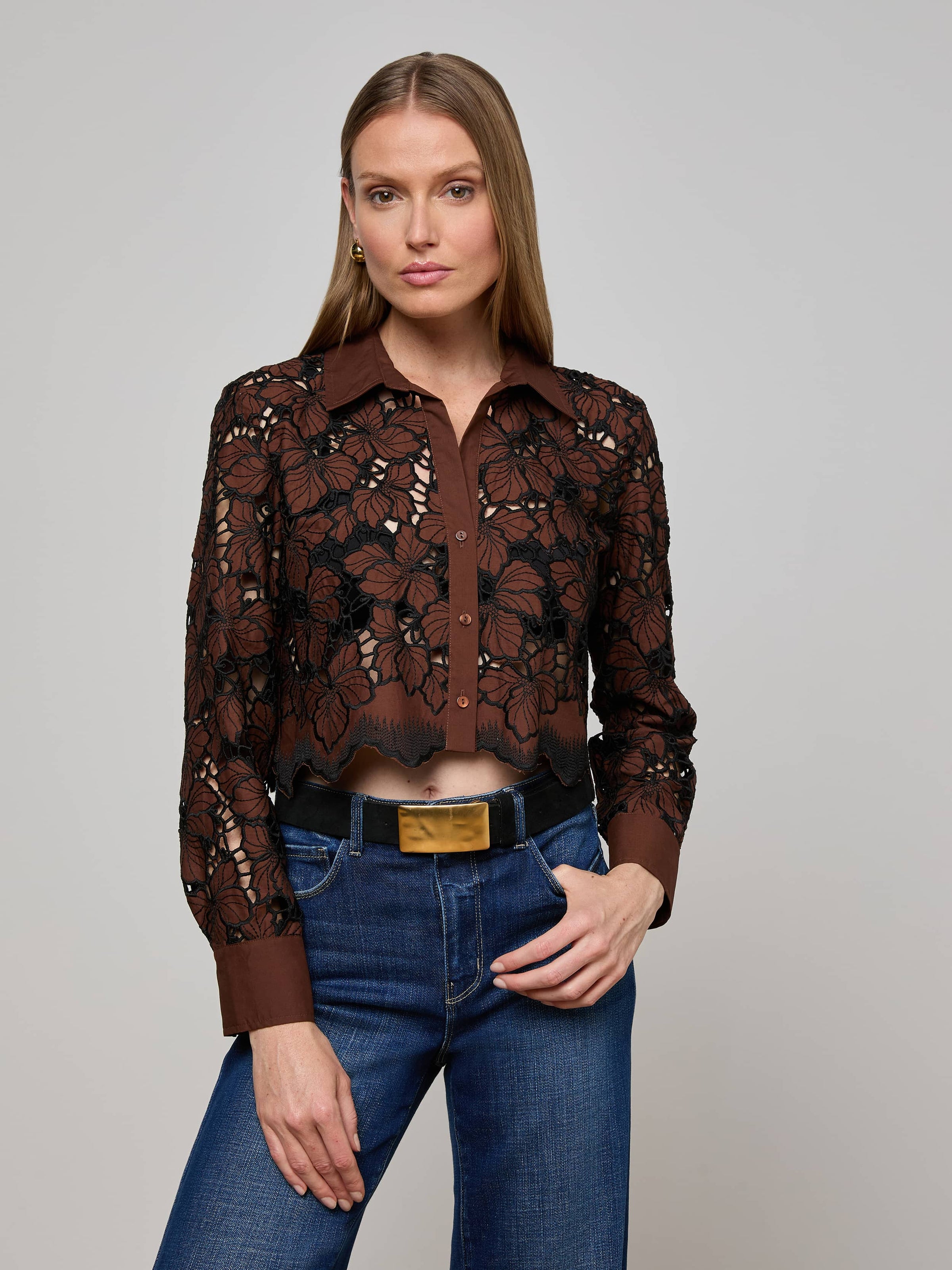 The Seychelle gives a modern twist to the lace blouse, featuring classic shirting details in a cool cropped cut. Now available in navy, it’s made from 100% cotton with a relaxed fit, scalloped hem, and front button closure. Unlined for a light, airy feel.