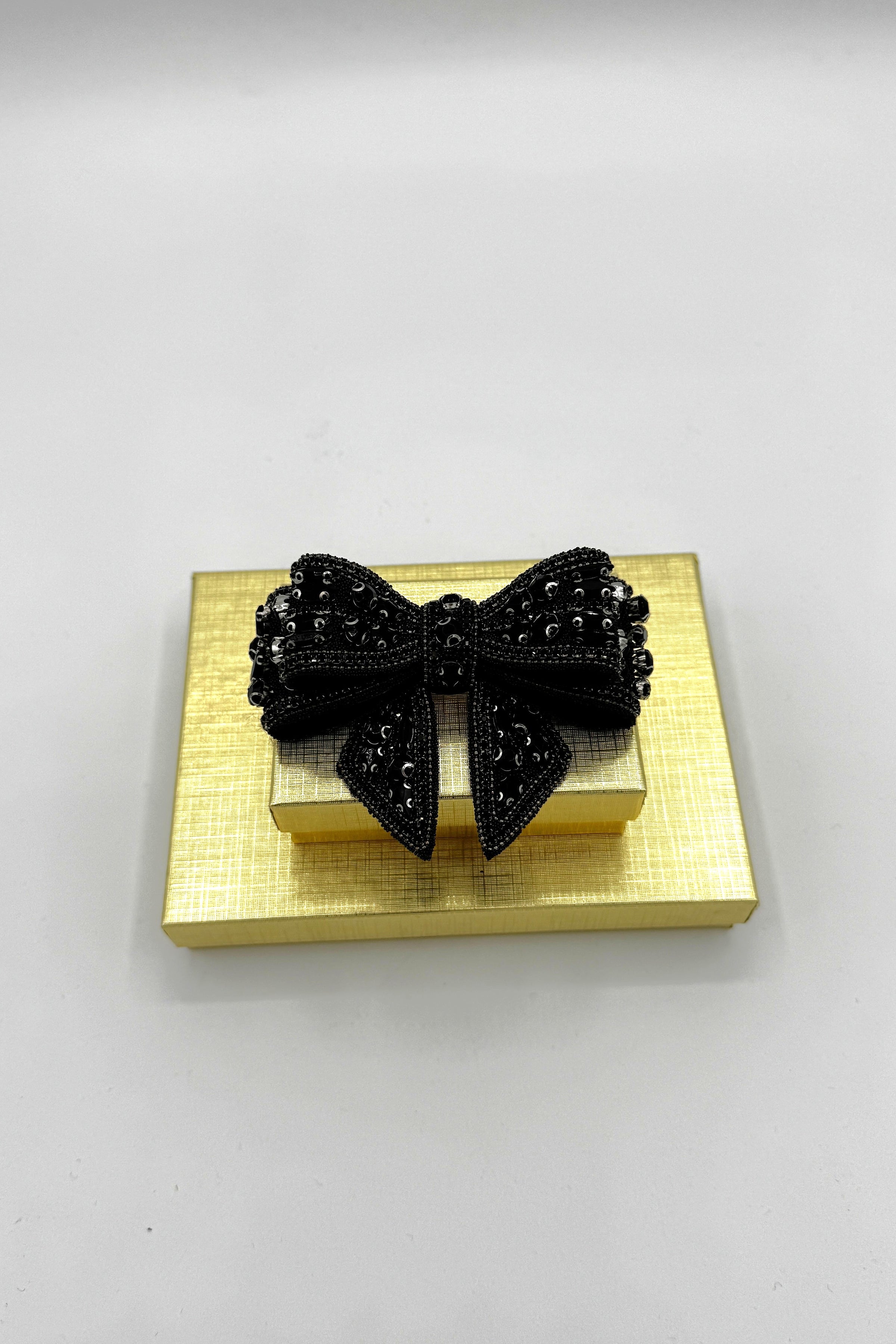Exquisitely detailed, this crystal bow pin features hand-set rhinestones and sequins arranged in a layered design for a dimensional effect. Available in silver, gold, red, and black, it adds a refined sparkle to jackets, dresses, or evening accessories with timeless elegance.