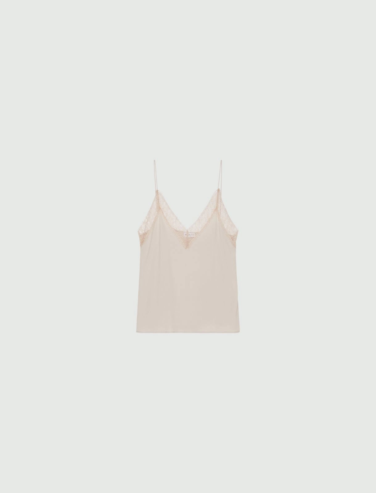 Crafted from a fluid silk blend, this camisole features delicate lace trim framing the V-neckline for a refined feminine touch. Designed with slender straps and a soft drape, it transitions effortlessly from layering essential to elegant standalone piece, offering versatility with timeless sophistication.