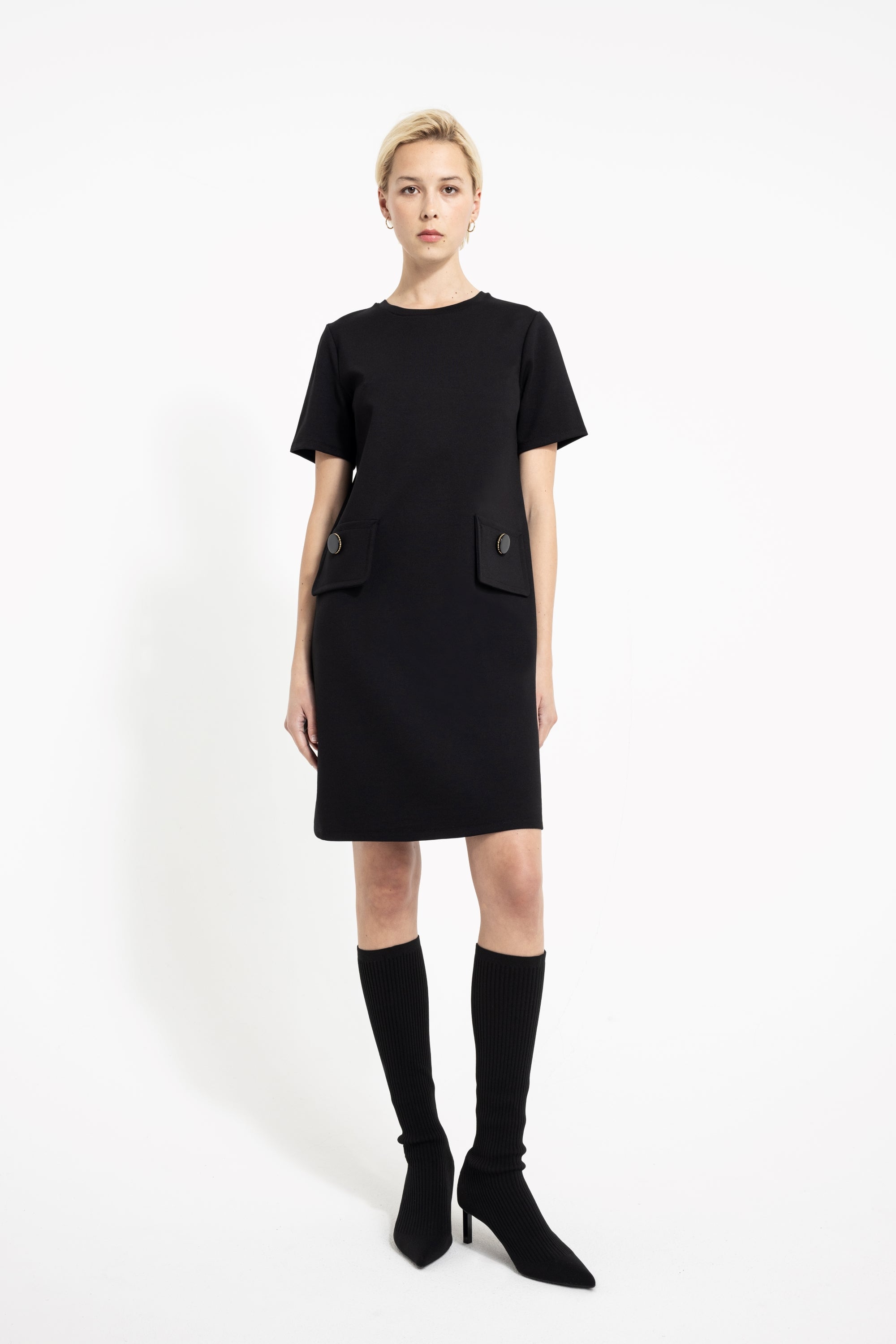 A modern shift dress with clean lines, short sleeves, and a round neckline. Defined by oversized flap pockets accented with bold two-button detailing, it offers a structured yet versatile silhouette. Effortlessly chic, this dress transitions seamlessly from daywear to evening sophistication.