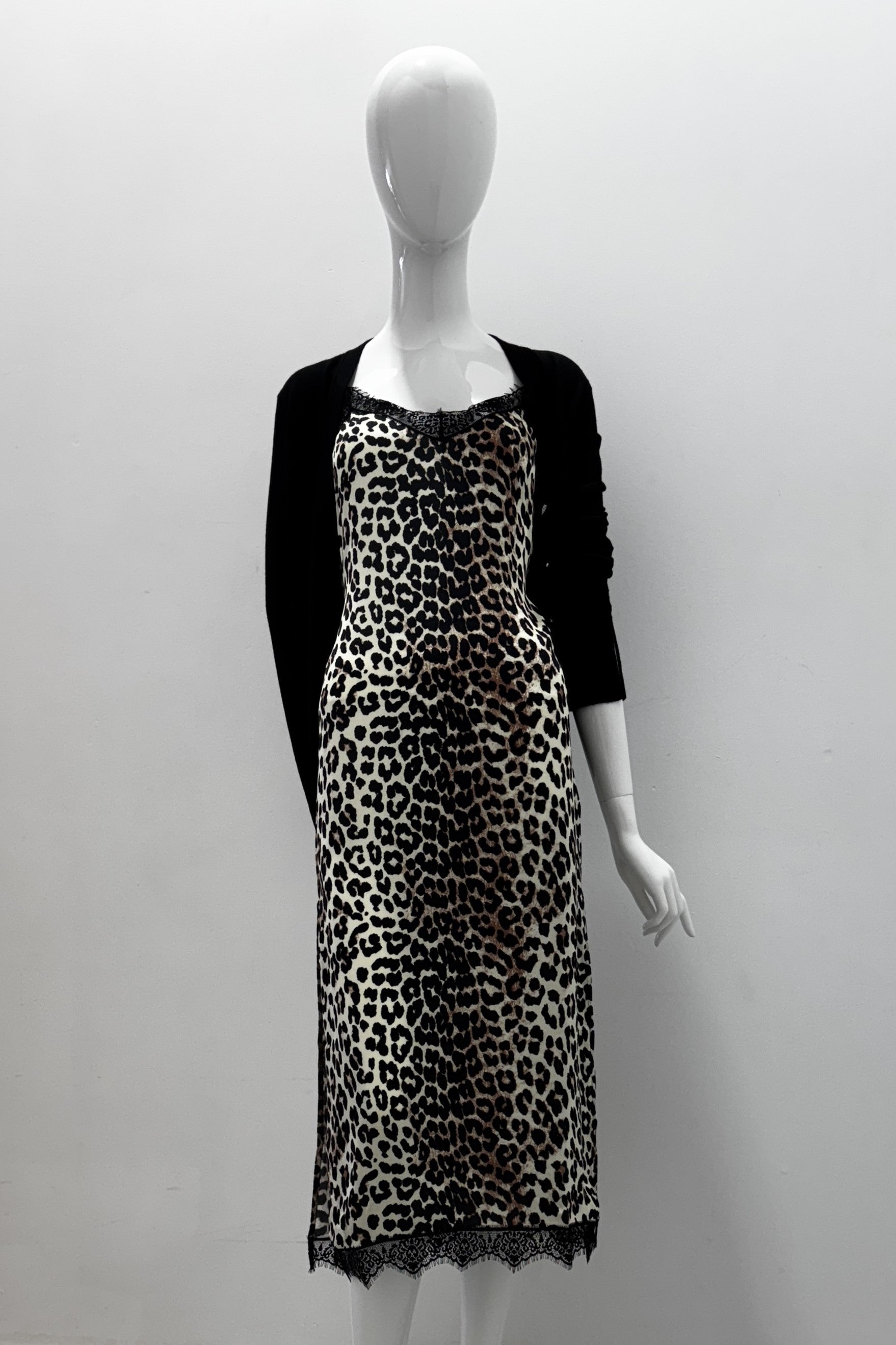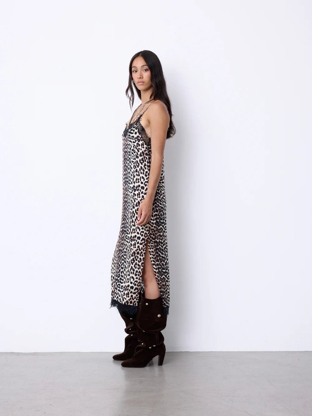 The Minerva midi dress features a striking leopard print, elevated with delicate lace trim along the V-neckline and hem. Its straight cut and side slits create fluid movement, while slender straps add refined femininity. A bold yet elegant piece, perfect for versatile day-to-evening styling.