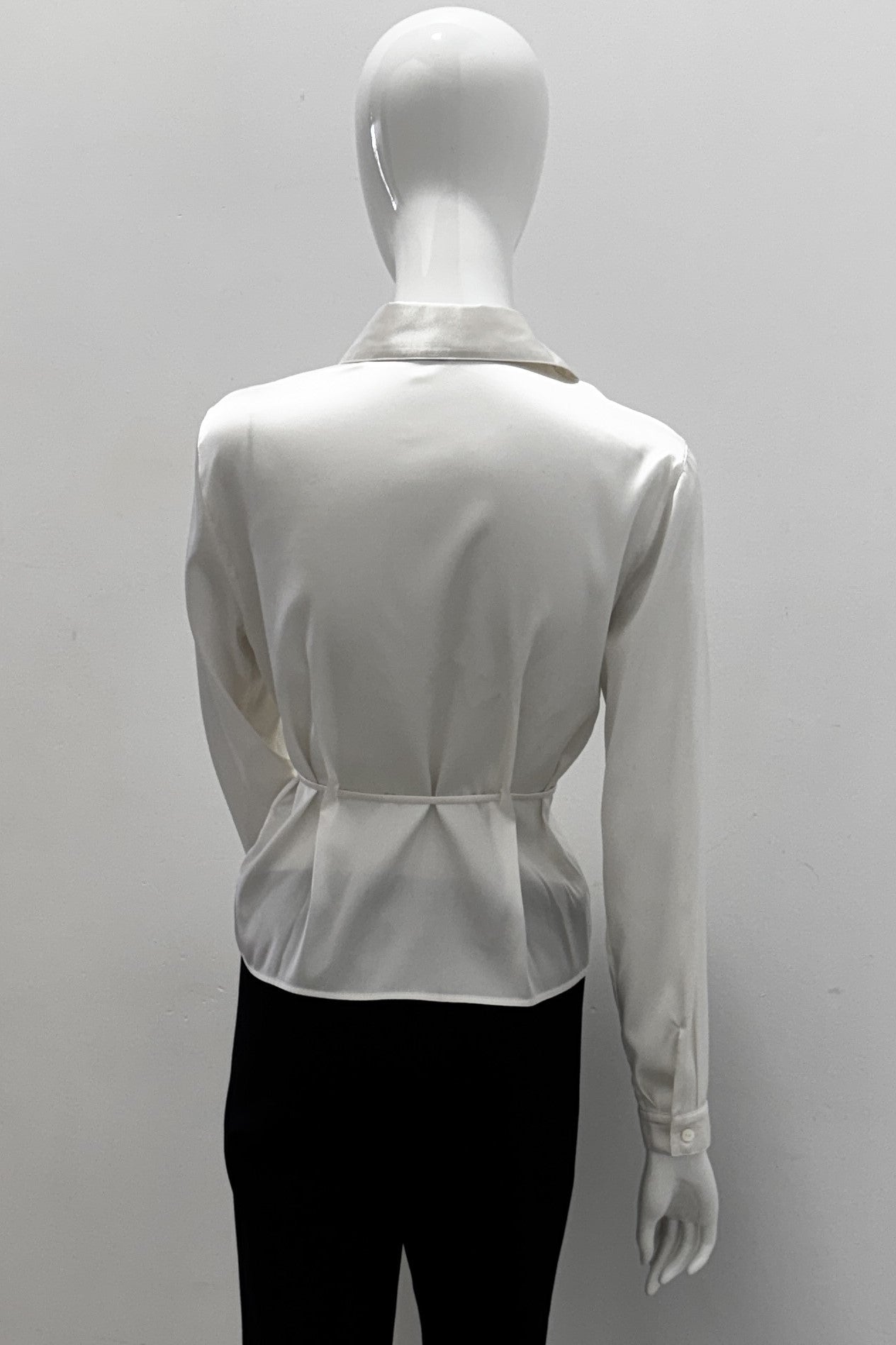 Crafted from lustrous silk, this blouse features a concealed button placket for a refined finish and a tie-waist detail that defines the silhouette. A pointed collar and long sleeves with buttoned cuffs add structure, while its fluid drape balances elegance and ease.