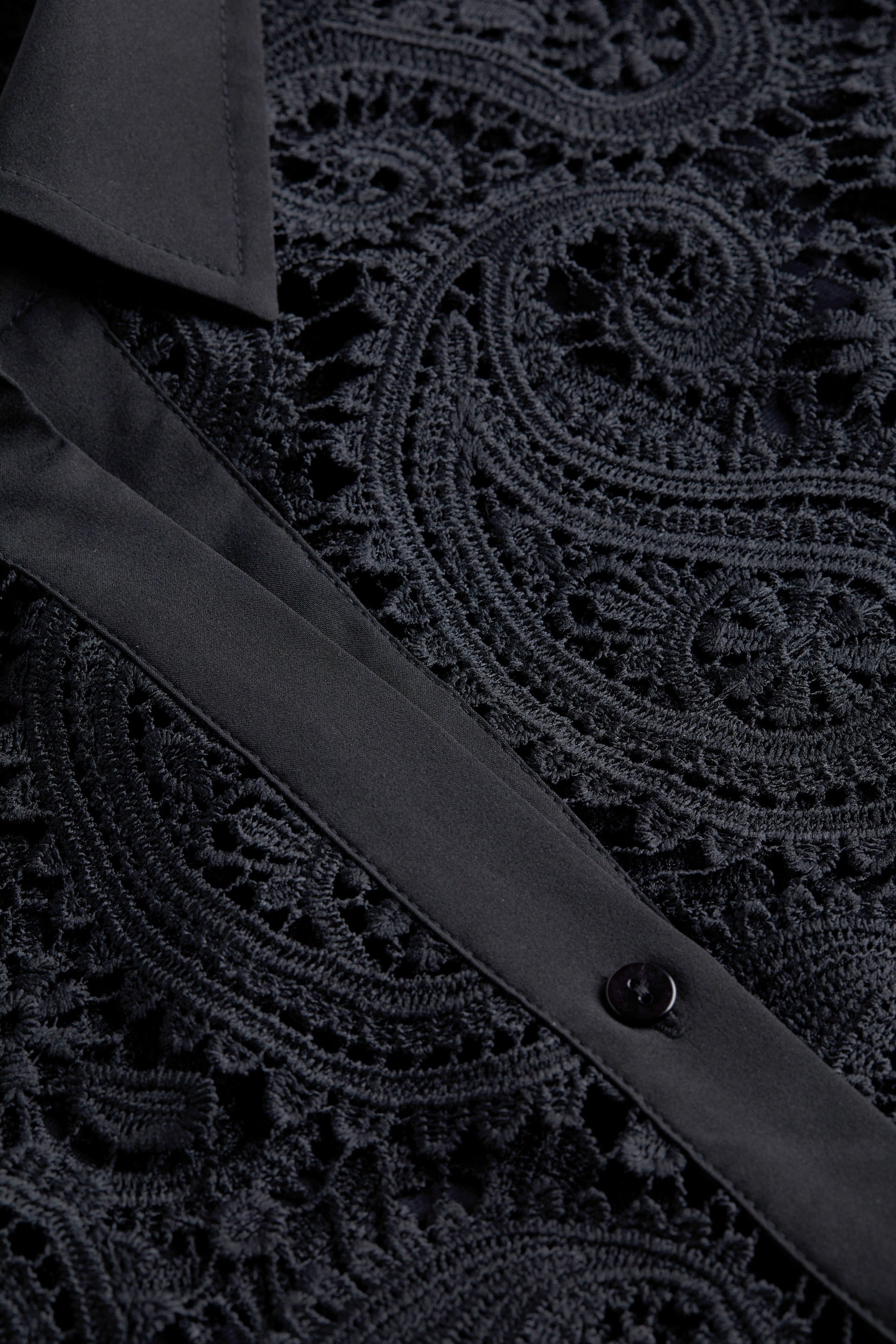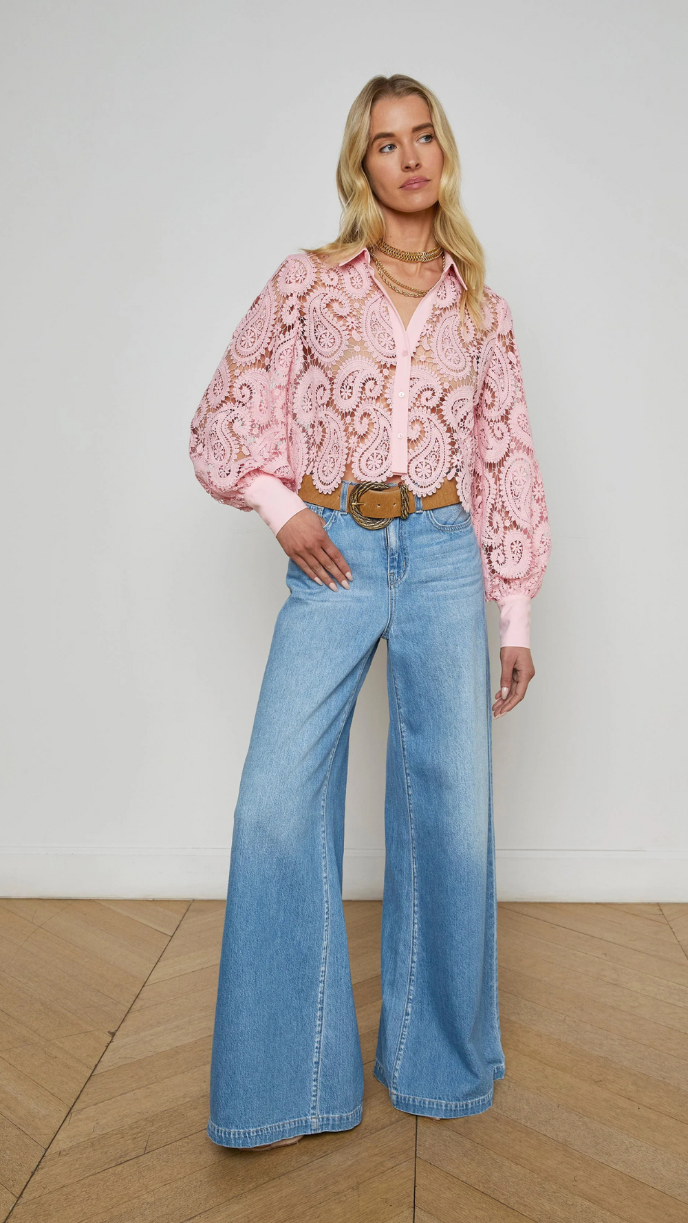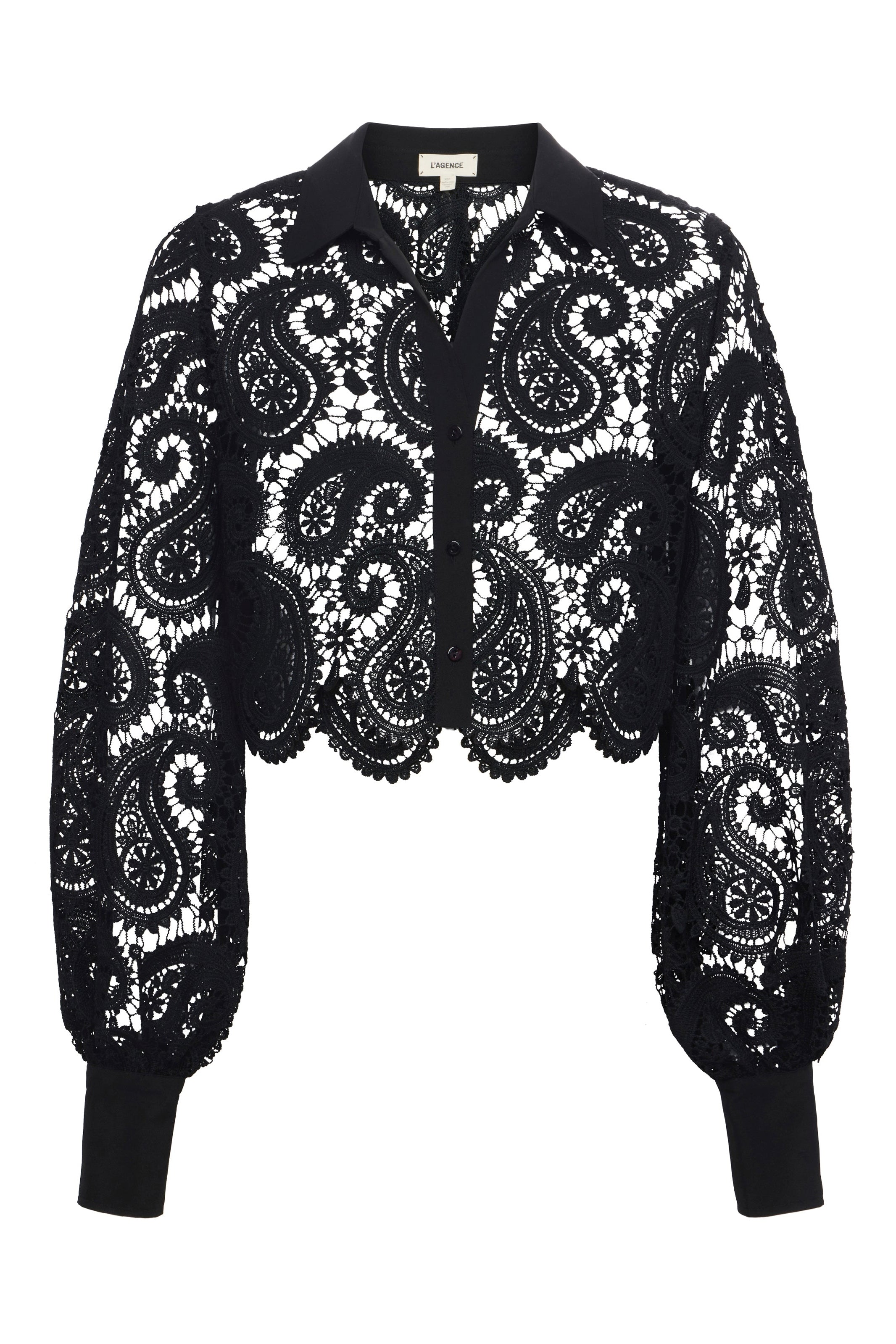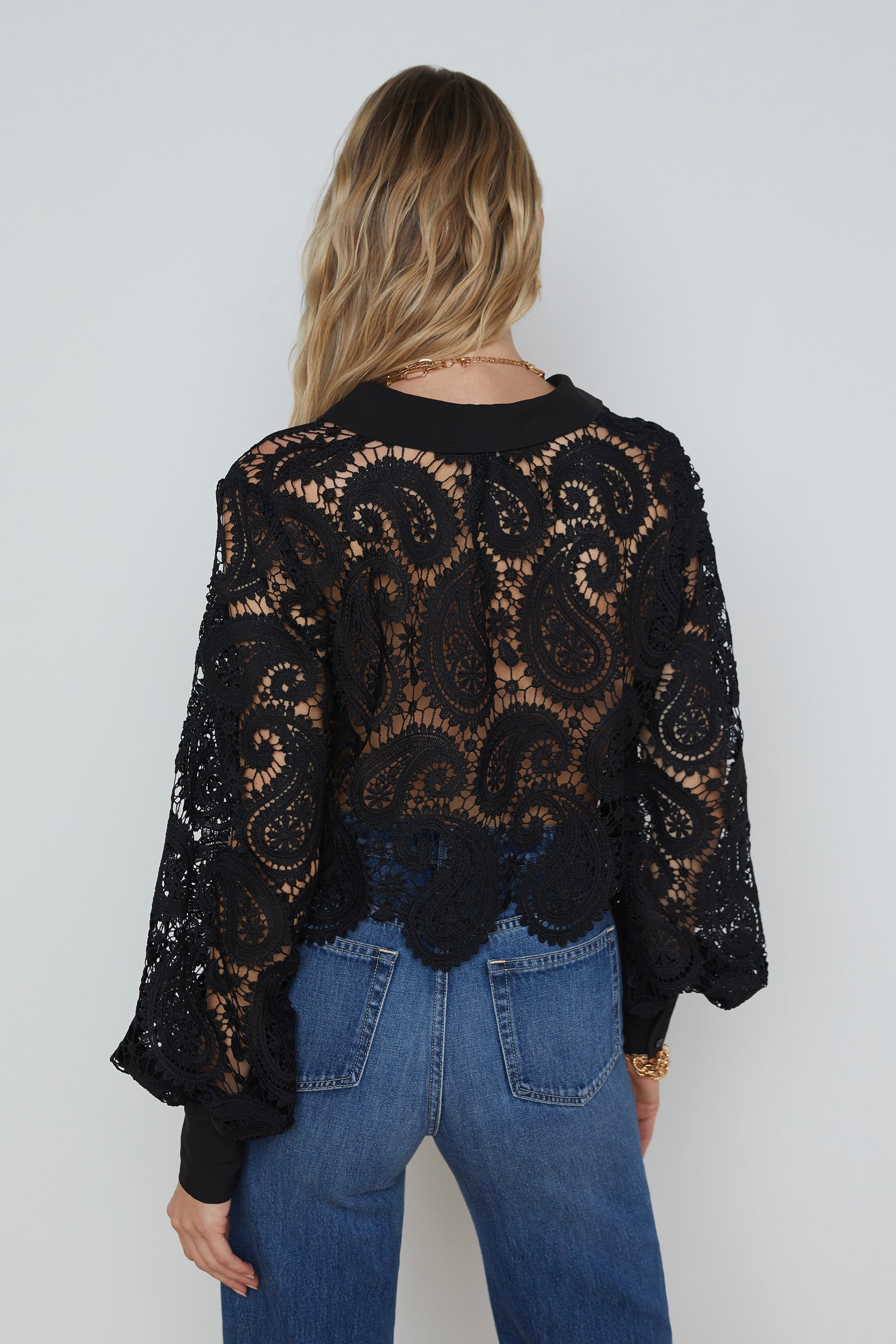 The Odelia is our modernist take on the lace blouse. A boxy, cropped silhouette delivers a cool, effortless feel that balances the feminine paisley lace and blouson sleeves. A sharp collar and button cuffs lend tailored crispness. Creates a beautifully balanced look with high-rise skinny jeans. Slip on over a colorful bikini for a unique beach look.