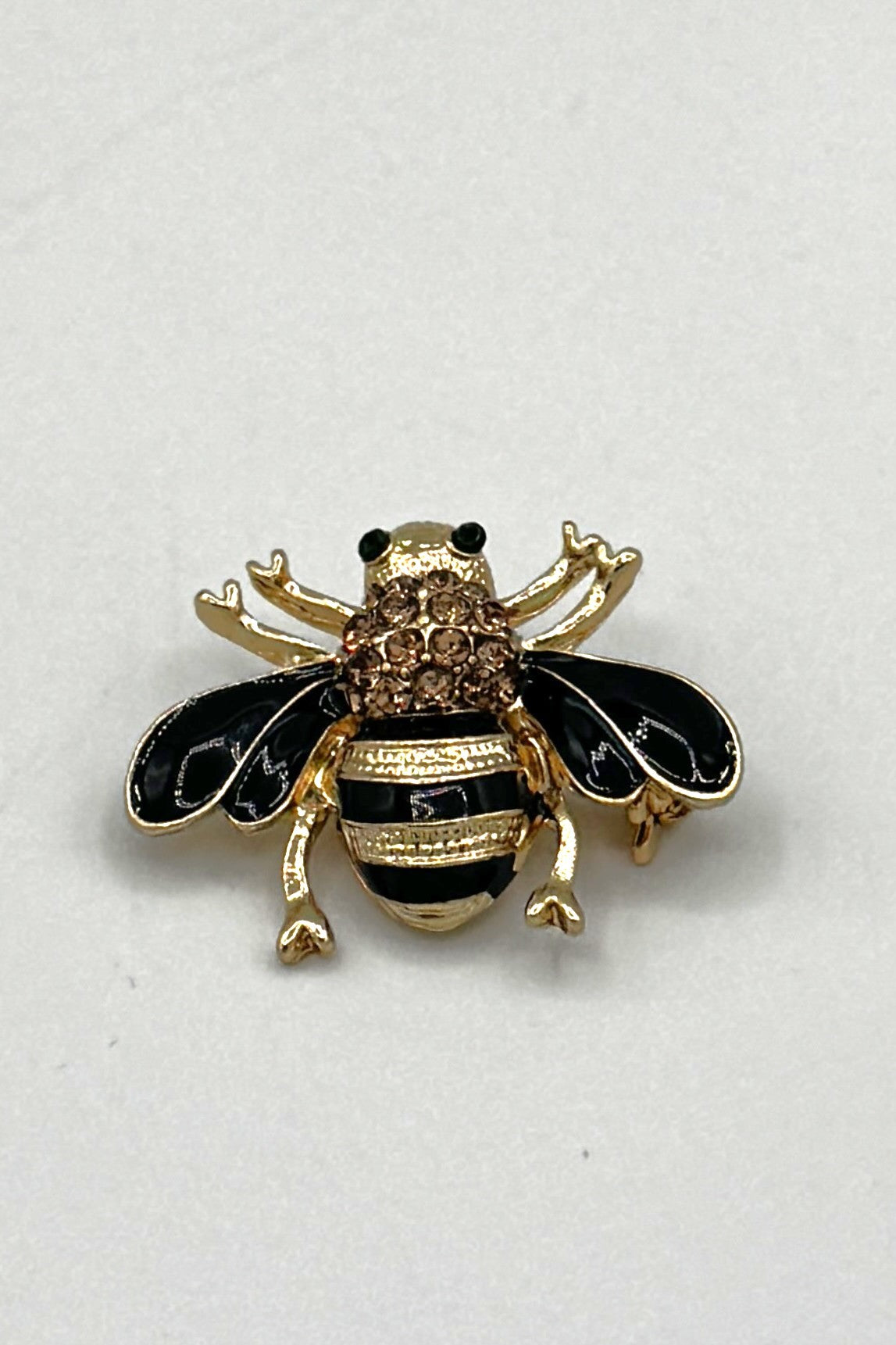 A charming gold-tone beetle brooch accented with glossy black enamel detailing on the wings and body. The textured thorax is embellished with warm-toned crystals for added sparkle, while sculpted legs and expressive eyes complete its refined, whimsical character. A striking accessory that adds playful elegance to any look.