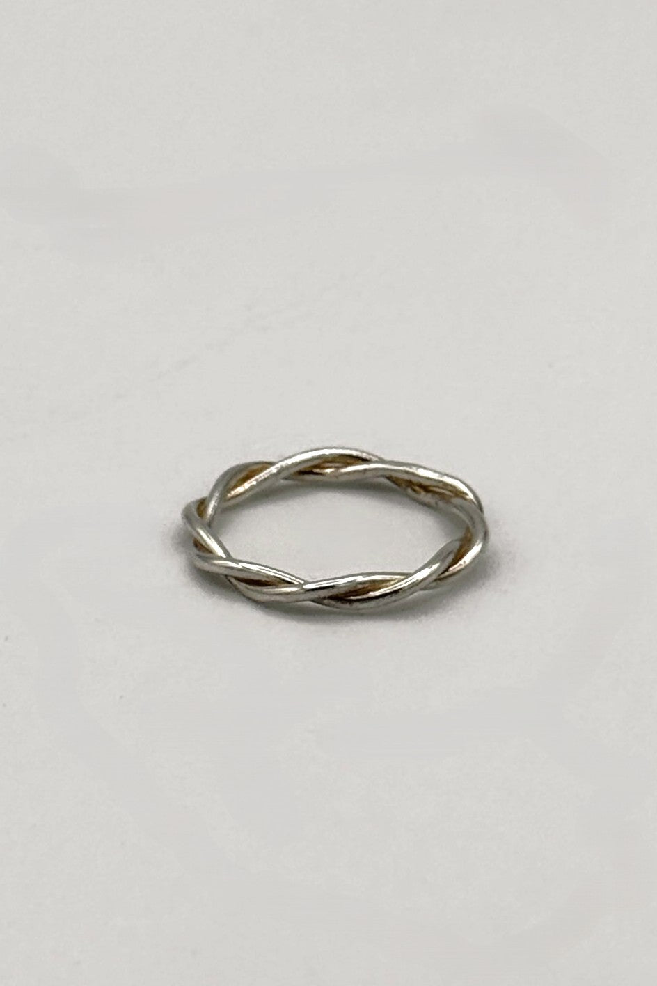 A delicate silver-tone ring crafted with two slender bands twisted into an elegant braided silhouette. Its lightweight, seamless design offers subtle texture and timeless simplicity, making it perfect for stacking or wearing alone as a refined, everyday accent.