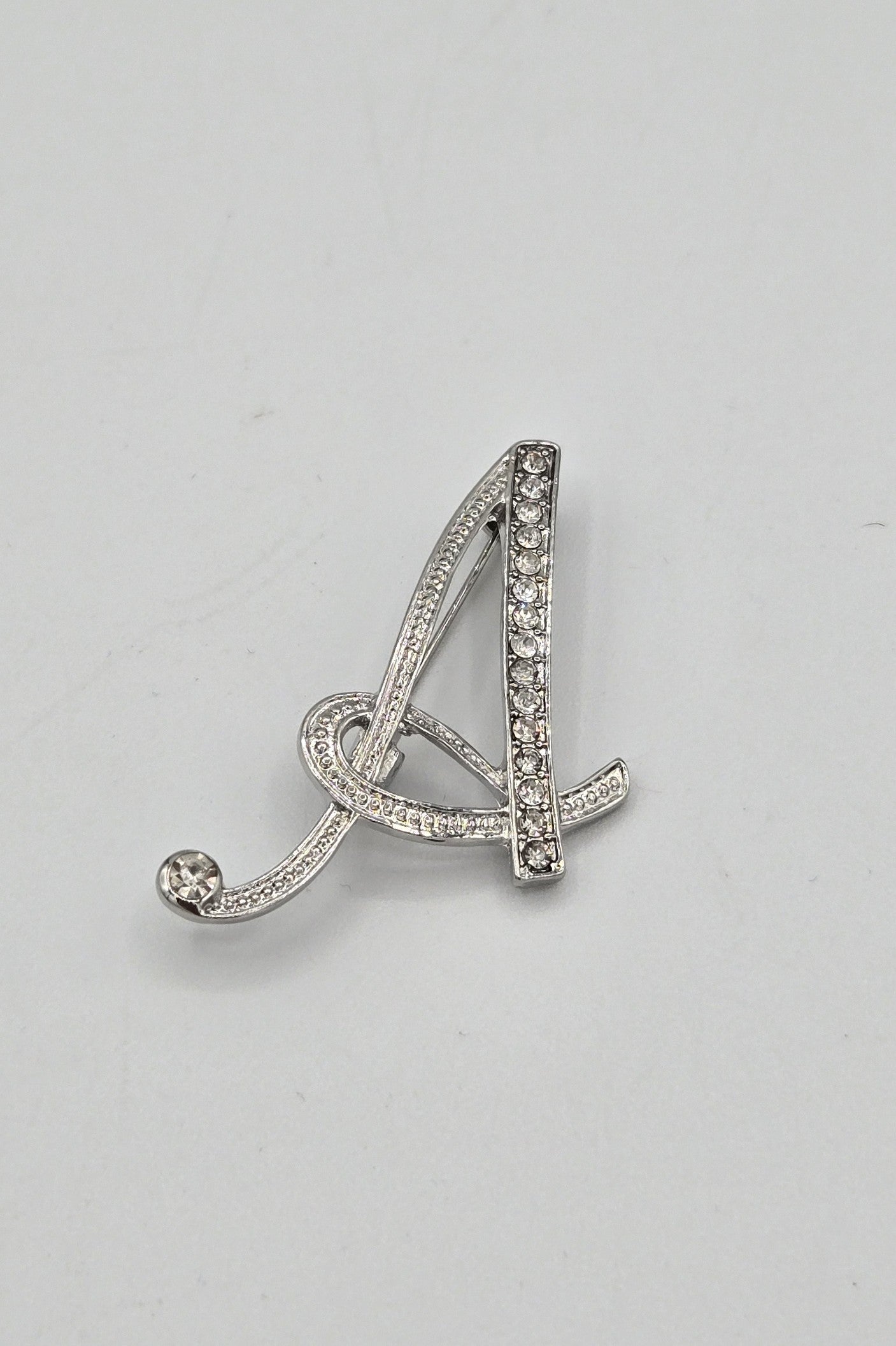 A sculpted silver-tone initial brooch accented with clear crystals, creating a refined shimmer across its flowing curves. The textured edging adds depth and vintage charm. A versatile statement piece that personalizes jackets, dresses, or accessories with elegant sparkle.