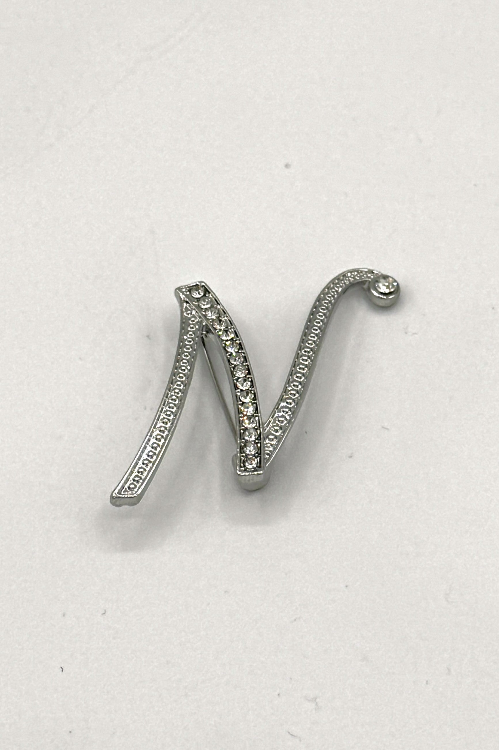 A sculpted silver-tone initial brooch accented with clear crystals, creating a refined shimmer across its flowing curves. The textured edging adds depth and vintage charm. A versatile statement piece that personalizes jackets, dresses, or accessories with elegant sparkle.