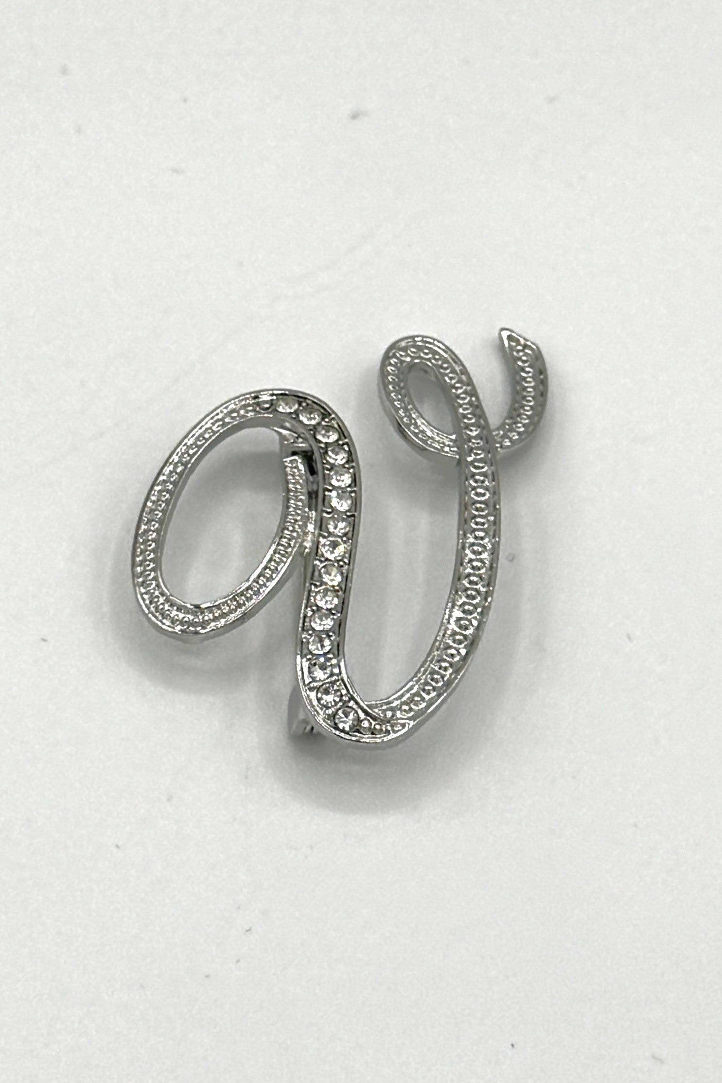 A sculpted silver-tone initial brooch accented with clear crystals, creating a refined shimmer across its flowing curves. The textured edging adds depth and vintage charm. A versatile statement piece that personalizes jackets, dresses, or accessories with elegant sparkle.