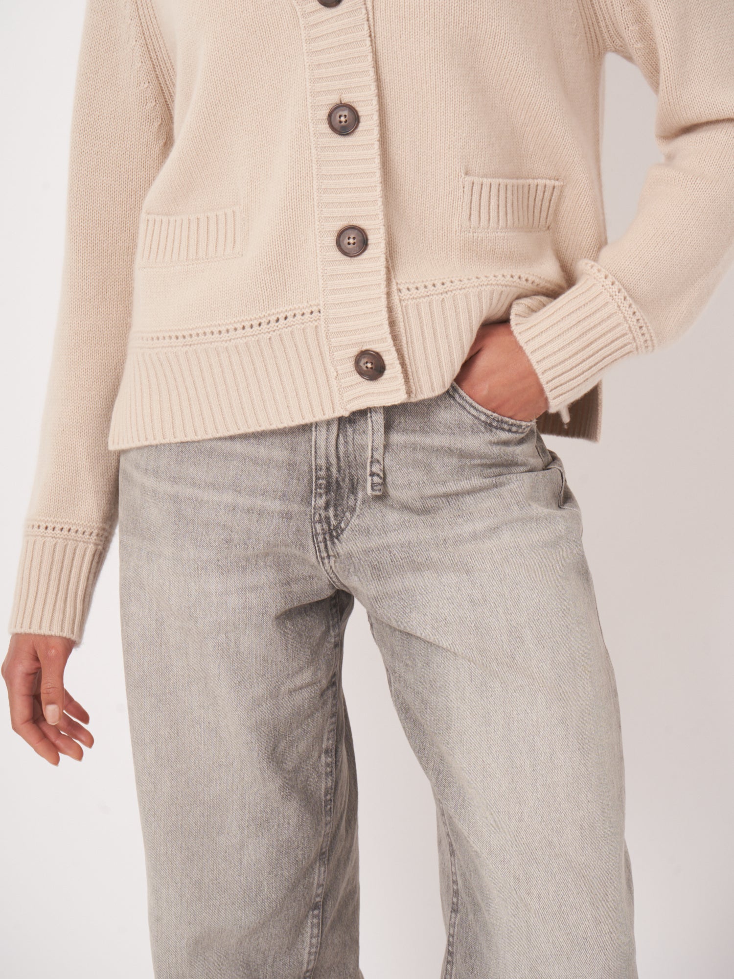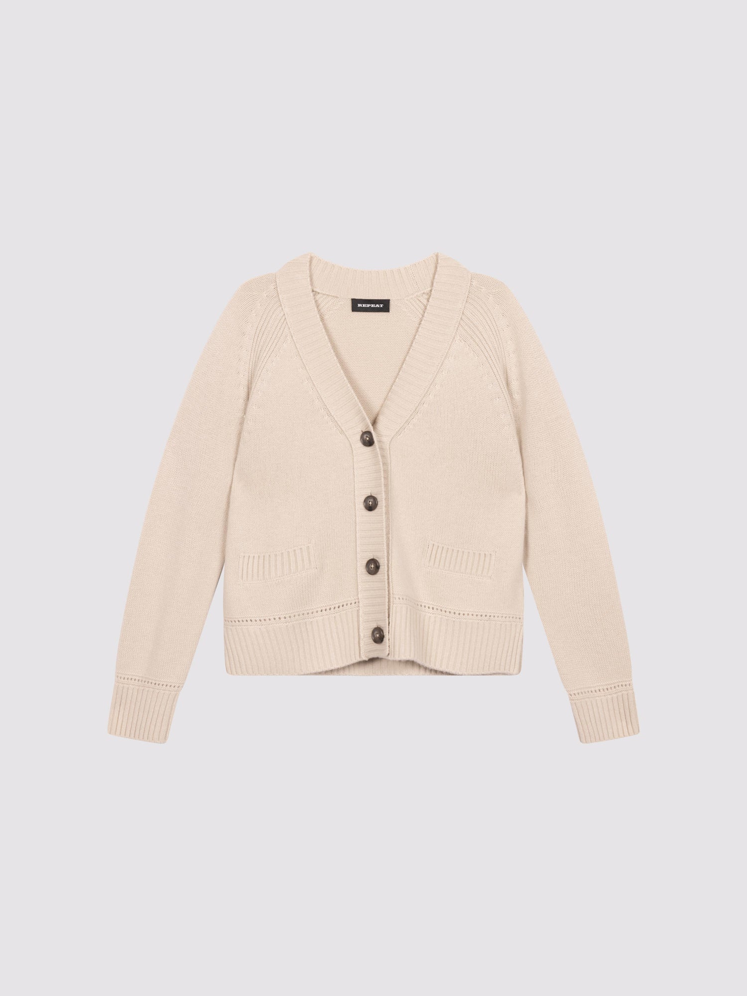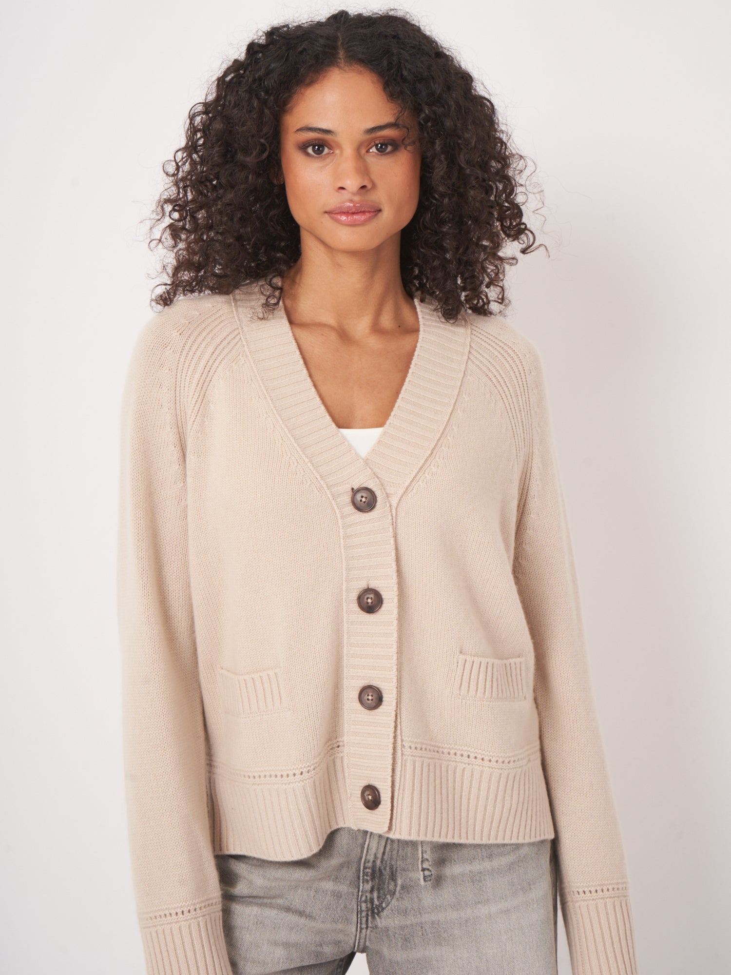 This soft cardigan features a relaxed fit with a deep V-neckline, oversized tonal buttons, and ribbed hems. Patch pockets and subtle eyelet detailing add dimension, while drop shoulders ensure effortless drape. A versatile layering staple with refined, casual charm.