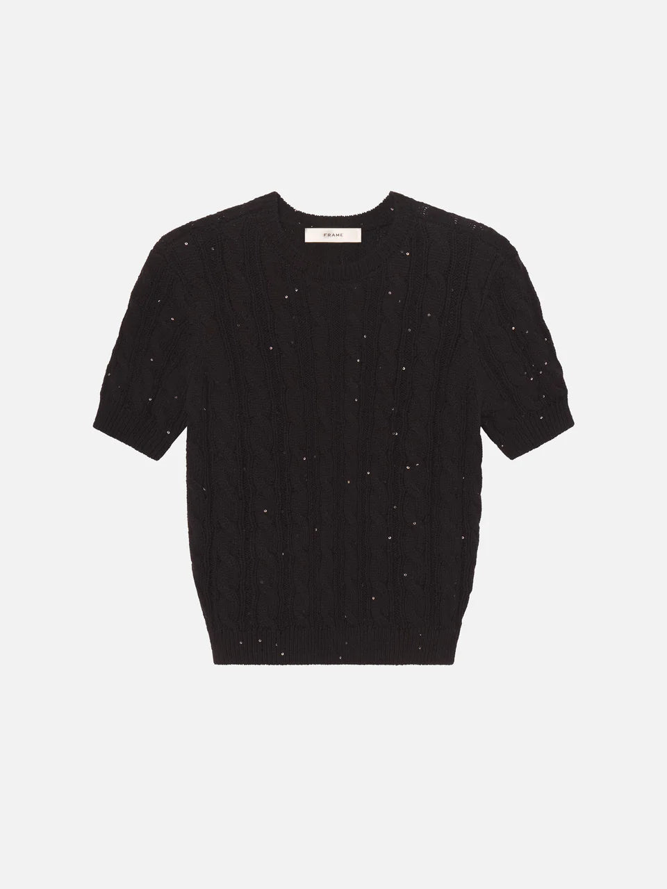 This elegant, short-sleeve sweater features subtle, sheer sequins throughout the body—a classy touch of sparkle. Cable-knit in a cashmere/cotton blend with a figure-flattering ribbed waistband.