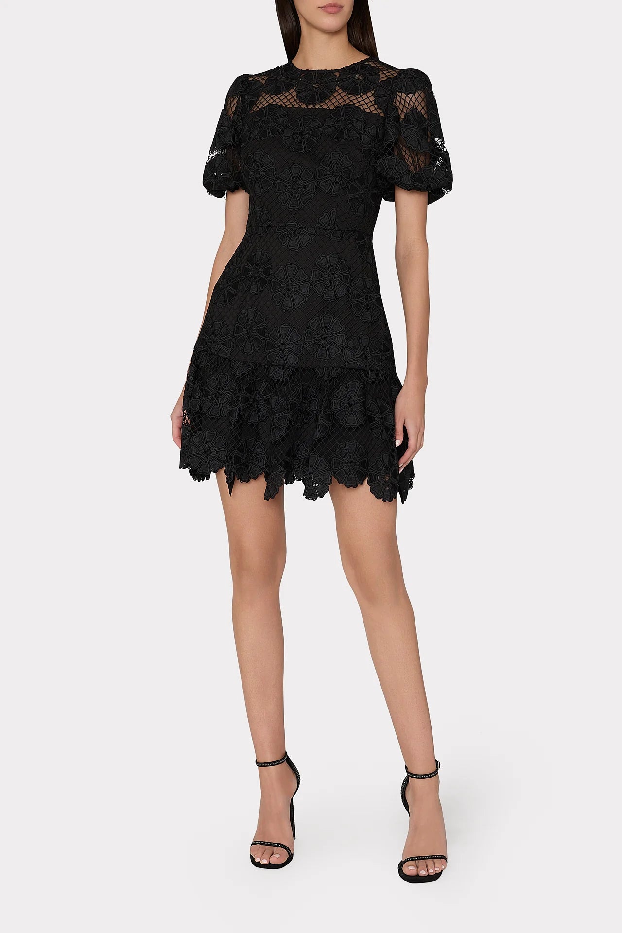 Elevate your cocktail party wardrobe with the Yasmin dress. This season’s version is done in our bursting bouquet black floral embroidery atop a mesh overlay. This mini dress features a feminine, slightly puffed short sleeve with a ruffled skirt. Minimal accessories required.