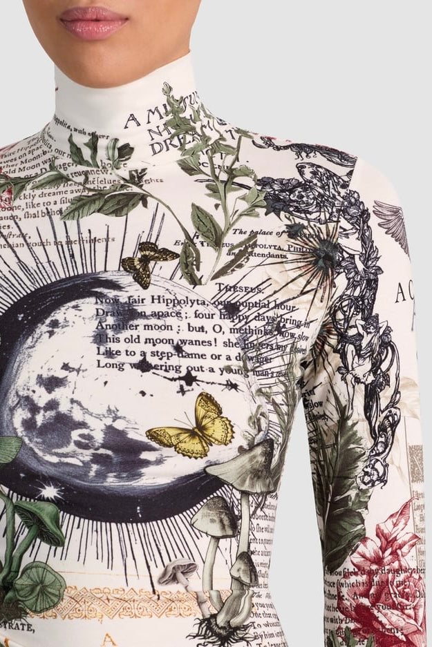 Alice & Olivia Delaina Turtleneck Top brings dramatic flair and refined elegance to everyday dressing. Part of the exclusive collaboration with the Royal Shakespeare Company, it showcases the striking dreamscape print that evokes a sense of artistry and theater. Crafted from ultra-soft viscose jersey, the fitted silhouette hugs the body comfortably while offering a sleek, polished look. The classic turtleneck provides a sophisticated neckline, and the long sleeves feature discreet thumbholes for a modern, functional detail. Perfect for pairing with high-waisted trousers, tailored skirts, or layered under blazers, this versatile top transitions seamlessly from day to night. Combining bold visual impact with luxurious comfort, the Delaina captures Alice & Olivia’s signature balance of creativity, drama, and timeless style.