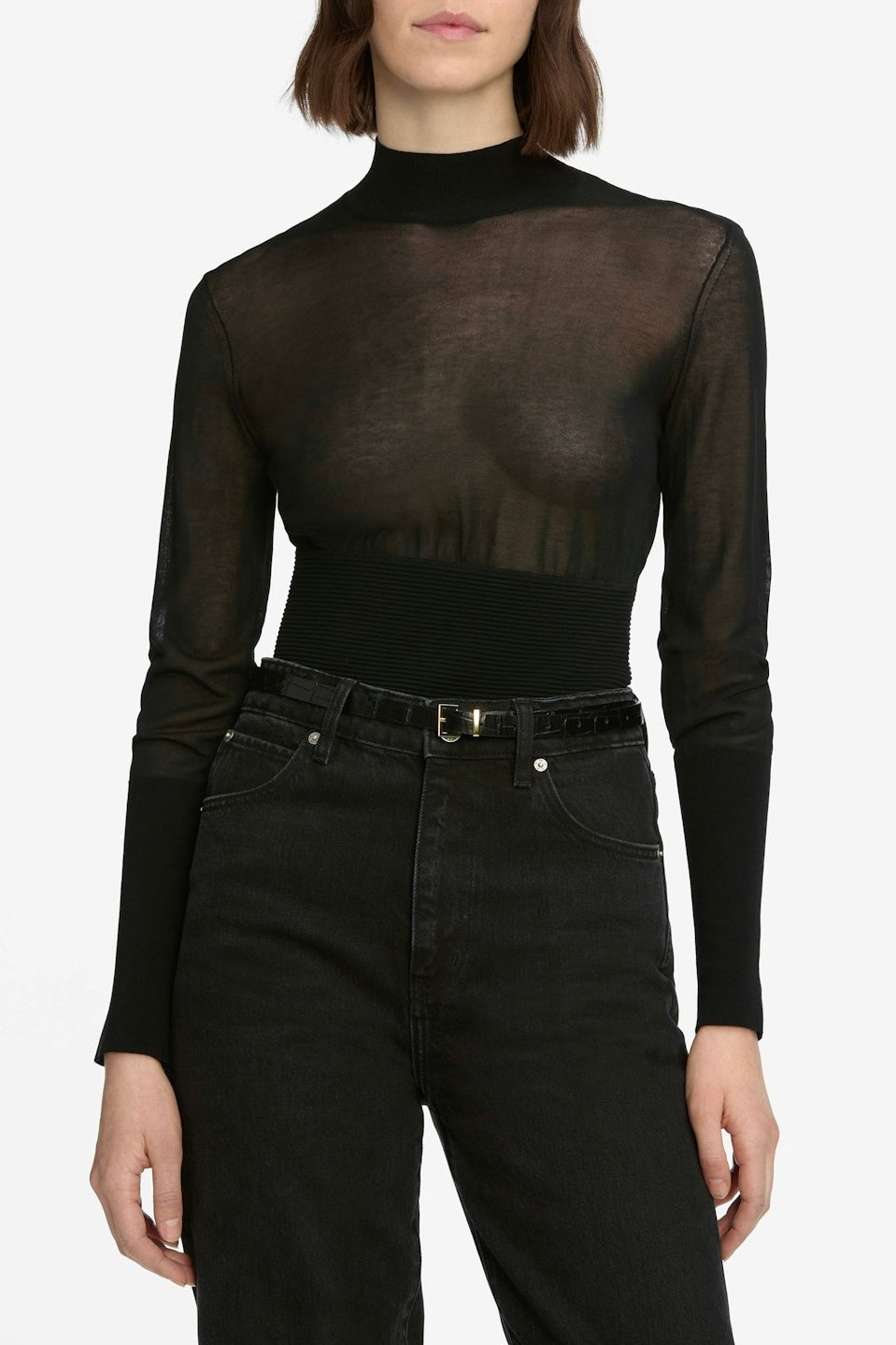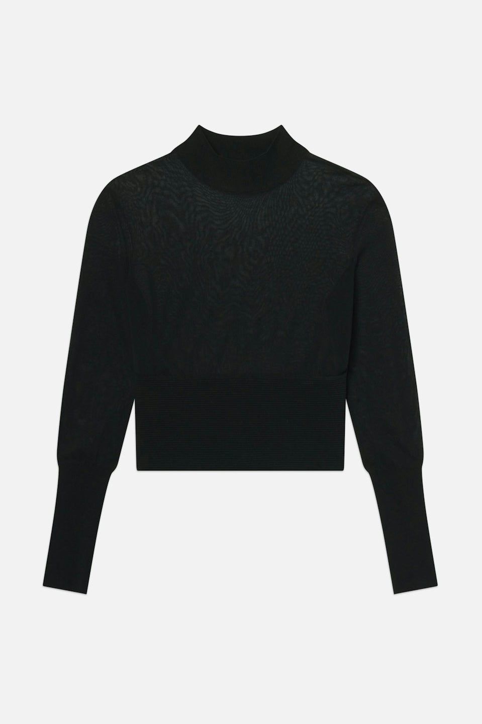 The Frame Sleek Sweater blends modern elegance with a hint of allure. Crafted from a lightweight, finely knit fabric, it features a softly draped blouson silhouette balanced by a snug bottom band that flatters the waist. A wide turtleneck adds refined structure, while the semi-sheer upper panel creates a subtle contrast, offering just the right touch of intrigue. Effortlessly versatile, this sweater moves from day to night with ease—pair it with tailored trousers for a sophisticated office look or style it with a sleek skirt or high-rise denim for evening outings. Comfortable yet striking, the Sleek Sweater delivers a feminine shape and understated edge, making it an elevated essential for any wardrobe.
