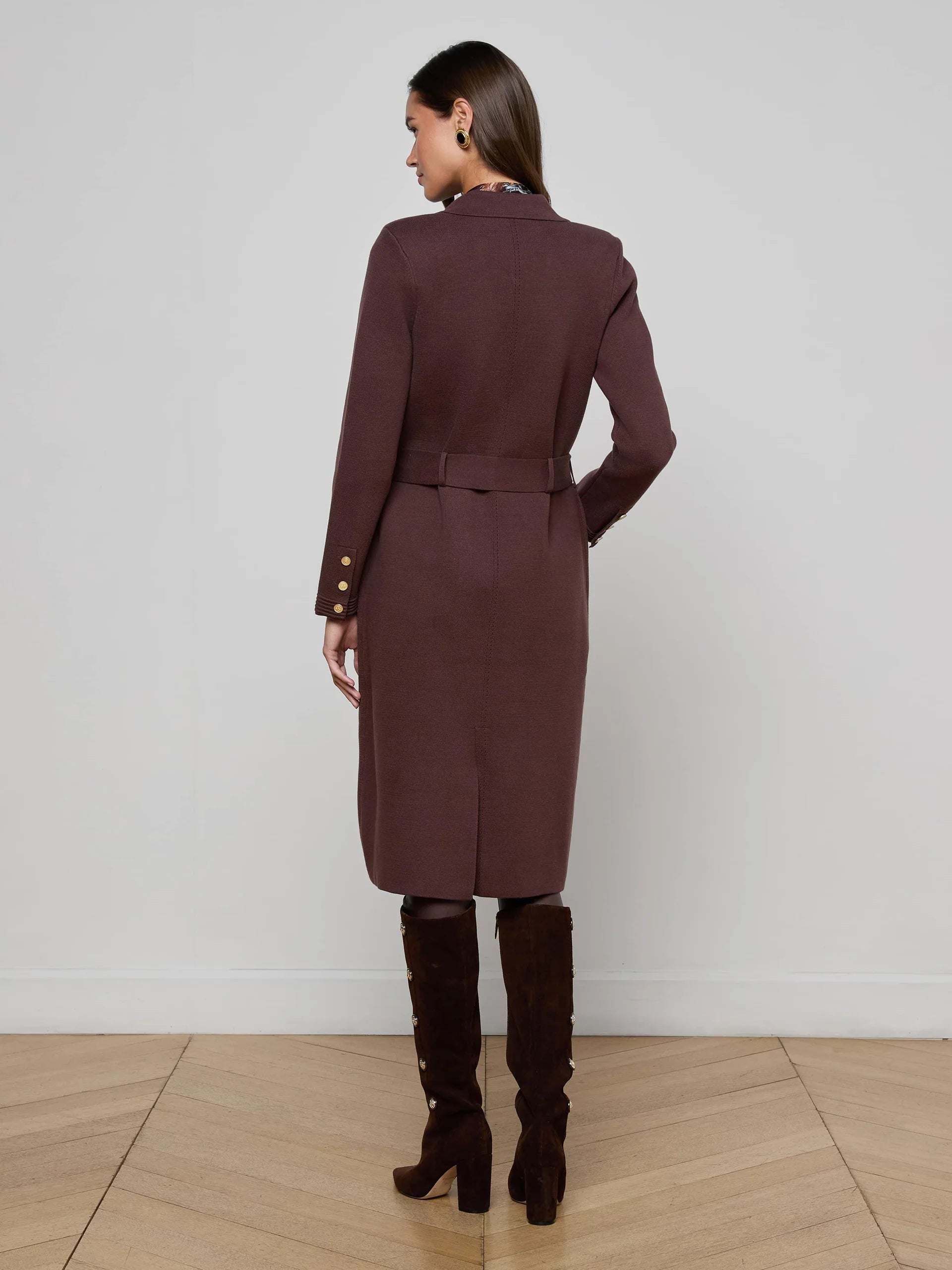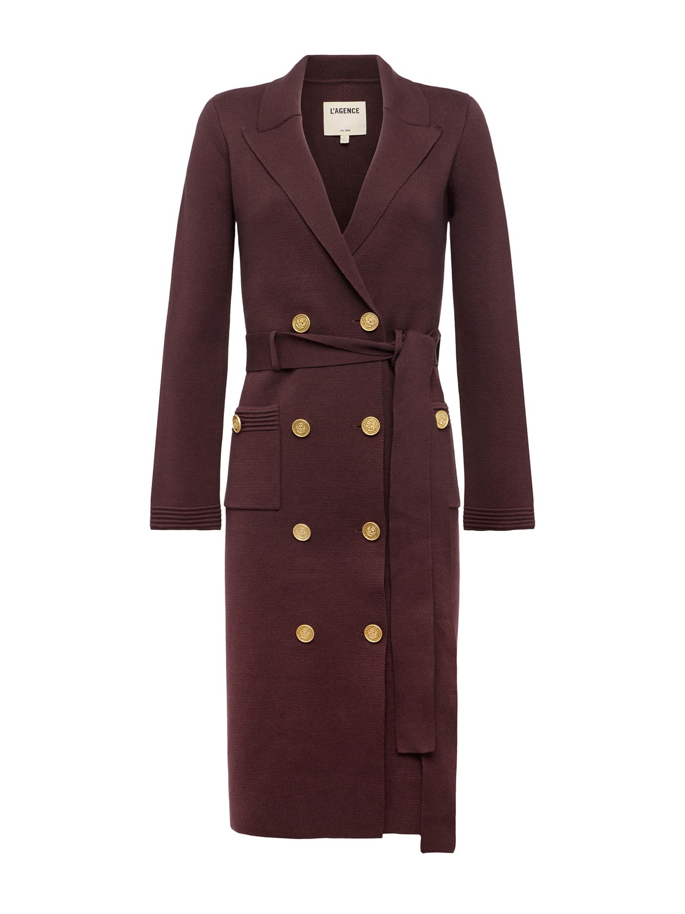 The Isabel coat merges sharp tailoring with luxe knitwear. Cut in a refined midi length, it features a double-breasted front with gold crest buttons and a self-tie belt that cinches the waist for a flattering finish. The structured lapels and patch pockets are a nod to classic tailoring, while the knit construction softens the look with ease and comfort. Wear it over jeans and a tee for an easy, polished look.