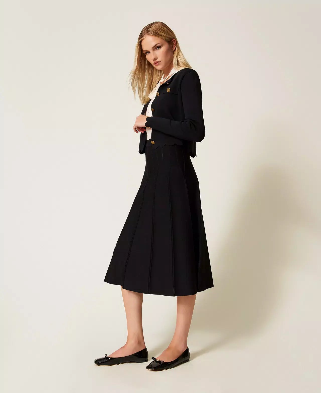 Crepe viscose knit midi skirt with vertical seams that create a pince effect. Elasticated waist, Oval T logo plate on the back, flared.