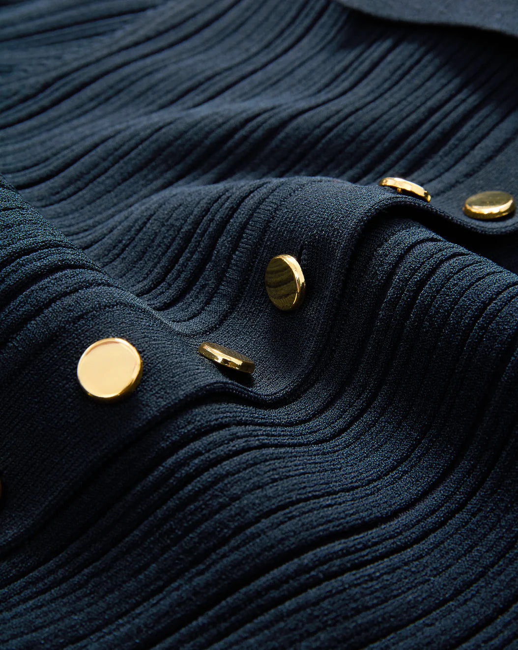 The ultimate 9-to-9 dress, the Lauper is refined enough for the office and cool enough for cocktails. Spun from a navy ribbed stretch-knit, it features a fitted mini silhouette and a trim collar that flows into a half-placket of gold buttons. Faux front pockets and elongated cuffs complete the look. A one-and-done style for instant polish, pair it with heels, flats, sneakers...you name it.