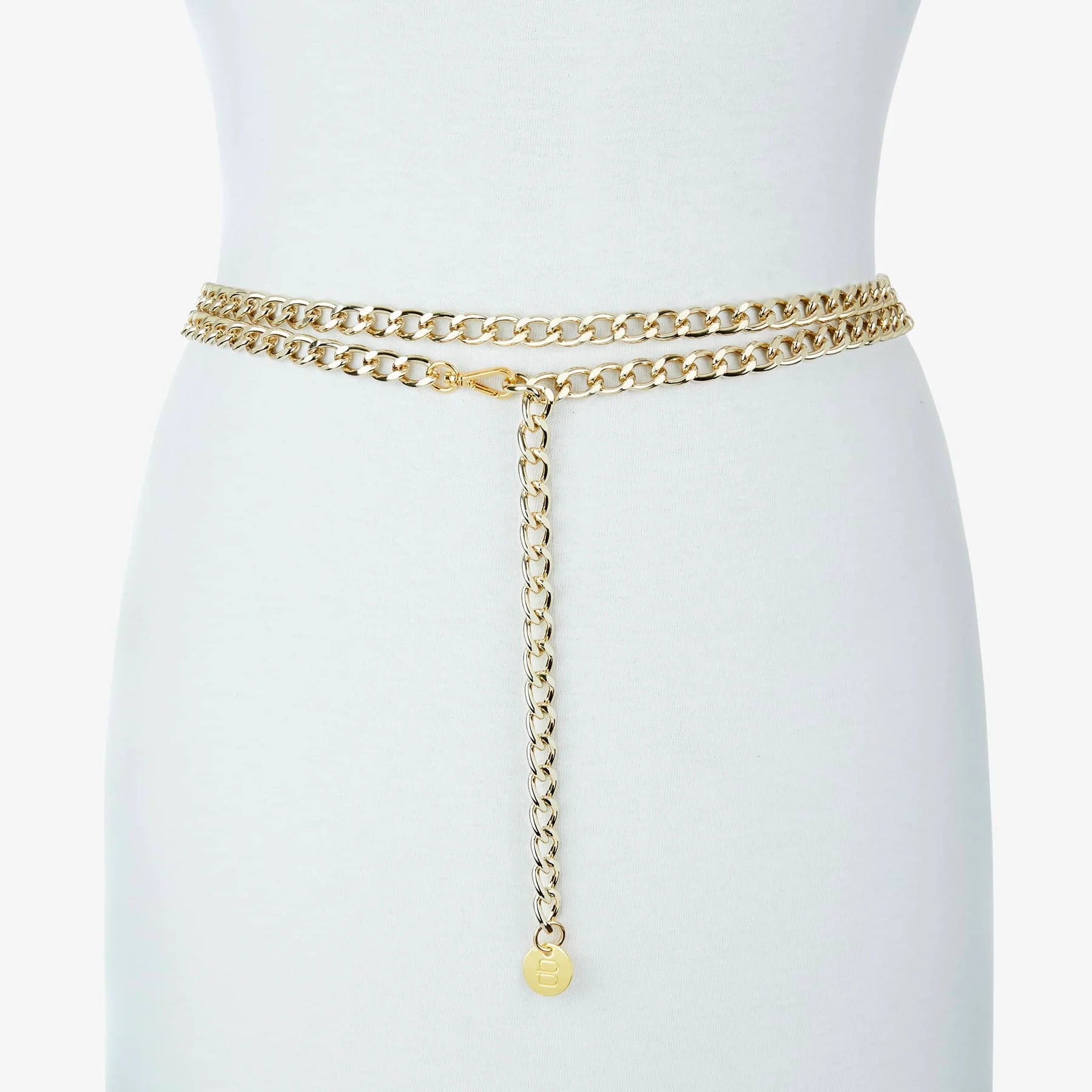 Nyasia is a double wrap chain belt with a center front closure. Add a touch of glam to any look.