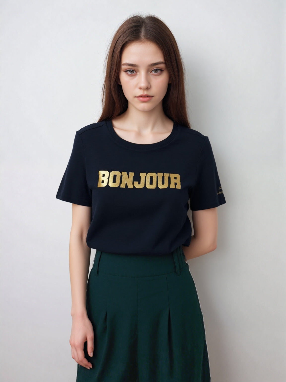A charming twist on a classic tee, this soft cotton top features gold foil "Bonjour" at the front and playful "Au Revoir" at the back—perfect for effortless everyday flair.