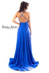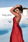 Turning to the gown's lower half, the full skirt cascades effortlessly to the ground, punctuated by a tasteful slit that reveals just the right amount of leg. This feature not only adds a dynamic visual element but also ensures ease of movement. The back of the gown presents an intricate criss-cross pattern that captivates the onlooker, offering a stunning view from every angle. This design choice exudes a sense of playful charm while maintaining a polished air of sophistication. The garment that promises to leave a lasting impression, embodying a graceful poise with each wear.