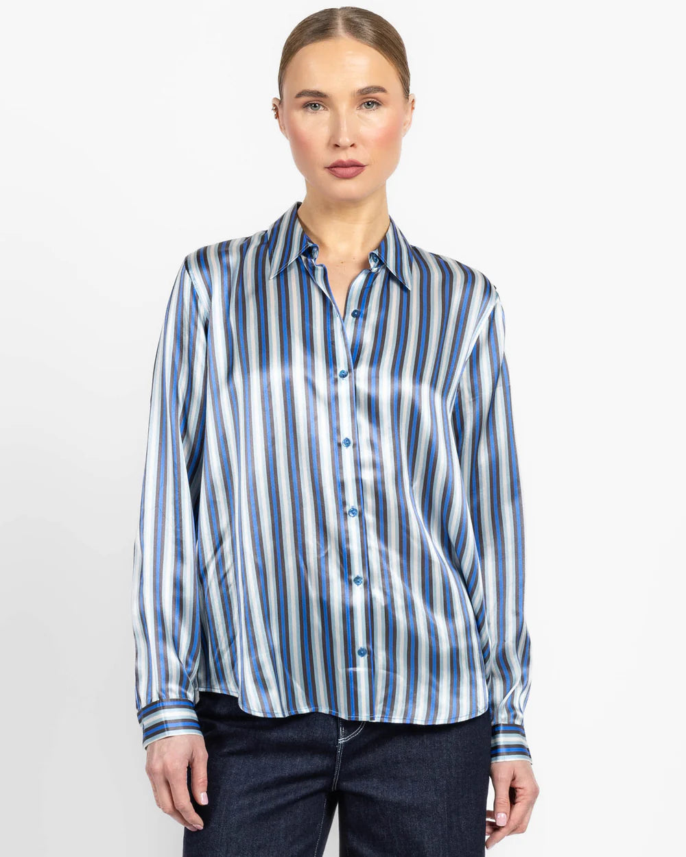 The L’Agence Tyler blouse features a fluid, lightweight drape with a polished button-front design. Its vertical stripe pattern in layered blue tones elongates the silhouette, while a classic collar and tailored cuffs complete the refined look. Versatile and effortless, it transitions seamlessly from day to evening.
