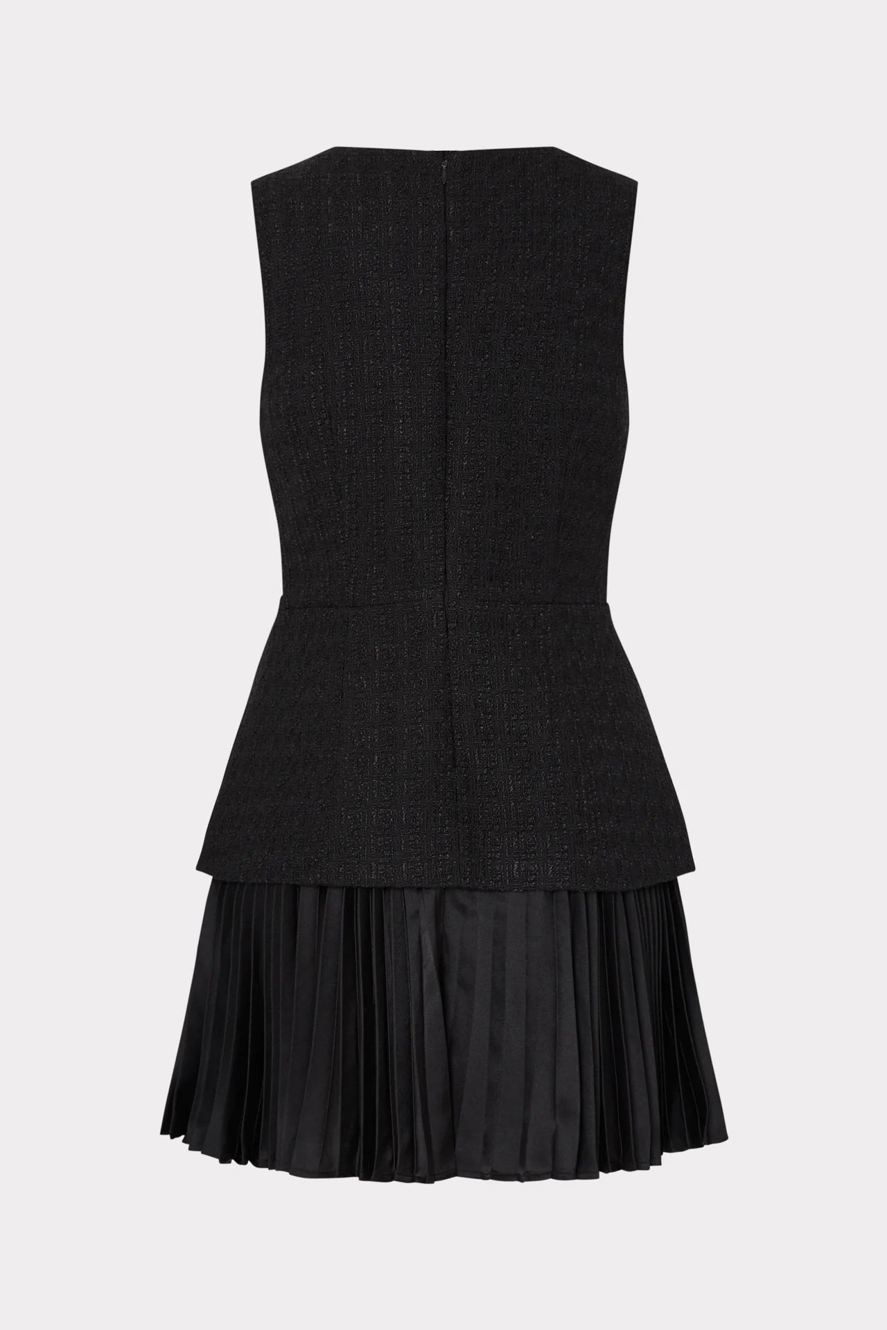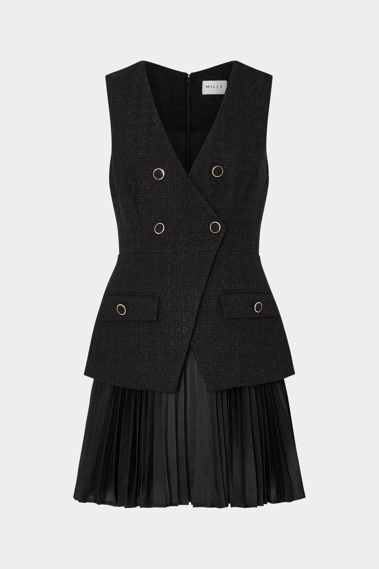 This mini blazer-style dress is crafted with a bouclé vest bodice combined with a pleated, satin skirt. It's finished with gold-covered button accents and a back zipper to close. This versatile style is great for cocktails, dinner parties, and even more formal events.